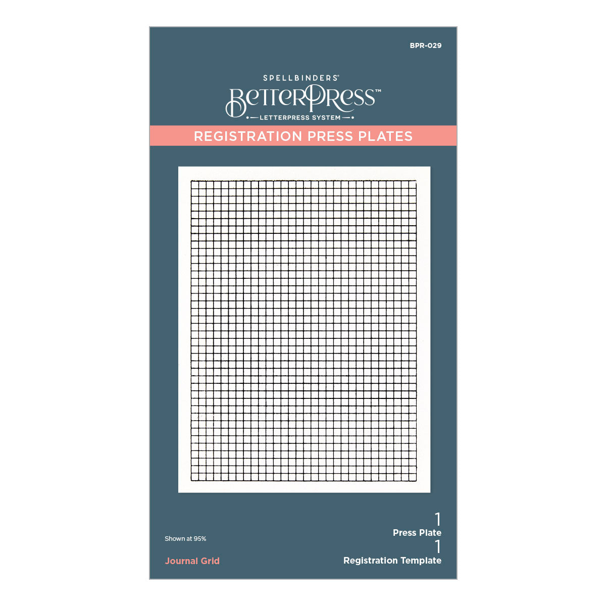 Journal Grid Registration BetterPress Plates SKU Registration BetterPress Plates are part of the Take Note Collection. The set of one press plate and two mylar printed registration templates come together to help you create your own grid paper! What a great background for a card, journal box and more.