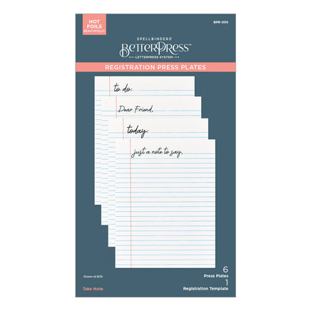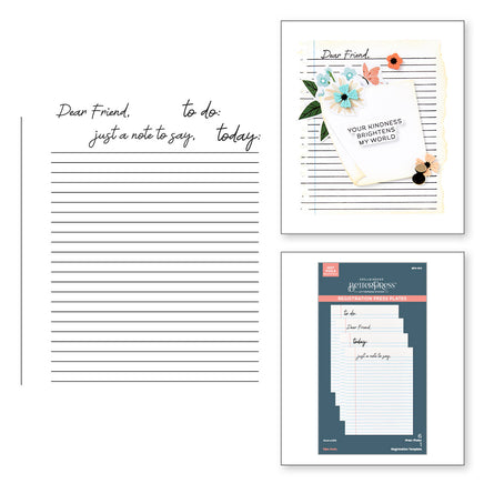Take Note Registration BetterPress Plates are from the Take Note Collection. The set of six press plates and mylar printed registration template come together to help you create a classic notebook page design. There are four sentiments to personalize: Dear Friend, Just a Note to Say, To Do and Today. What a fun way to capture memories for journaling, or for a unique background on a card!