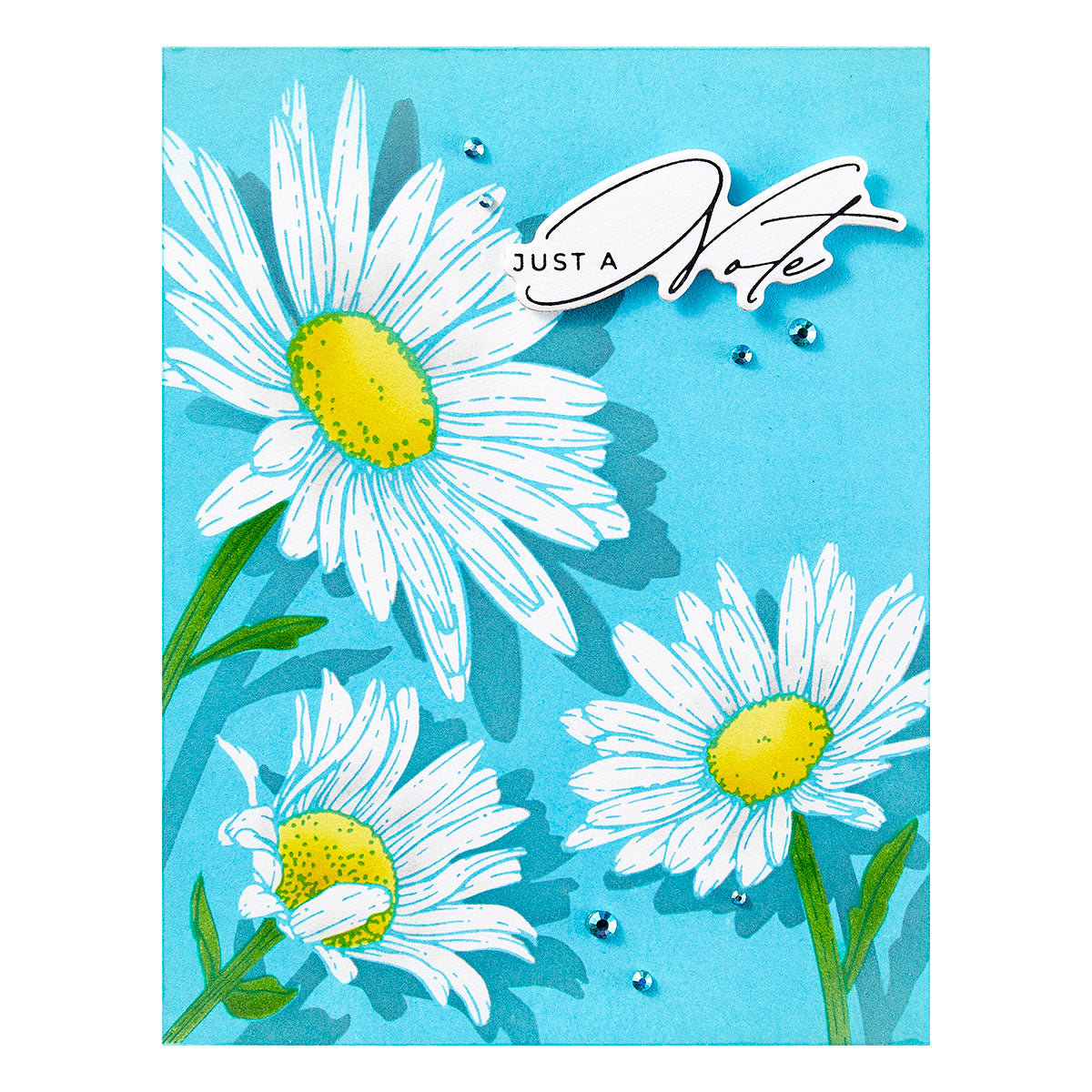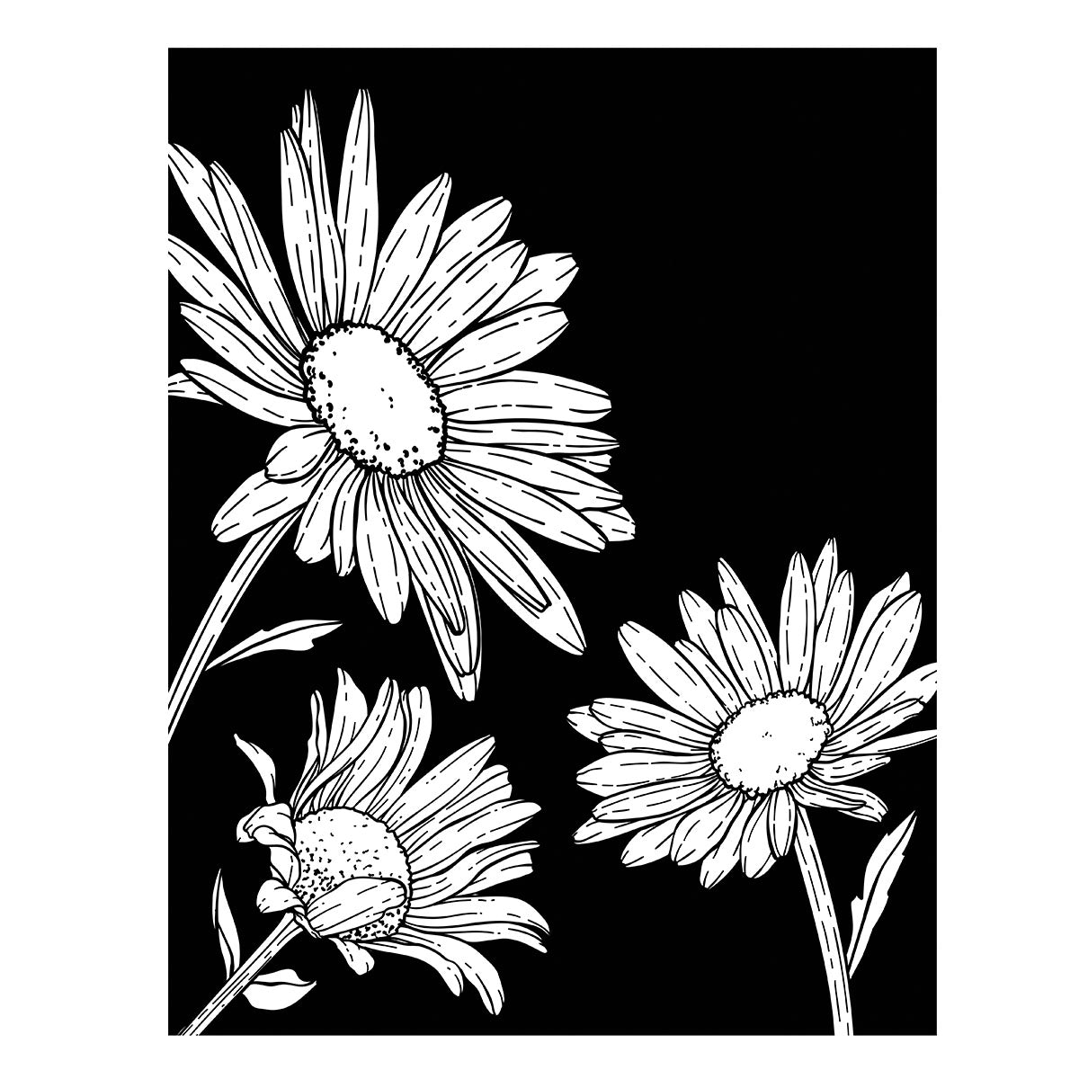 Daisy Trio Press Plates are from Yana's Daisies Collection by Yana Smakula. This sweet plate presses three full bloom daisies on an A2-size (4.25 x 5.5 inch) card front. To add more depth, use STNB-005 Layered Daisy Trio Stencil (sold separately or purchase both with the BD-0946 Daisy Trio BetterPress and Stencil Bundle) to add color with inks, paints and paste mediums. Ink the plates with the BetterPress Ink to be pressed against the BetterPress Cotton Card Panel and Sheets for a crisp letterpress design.
