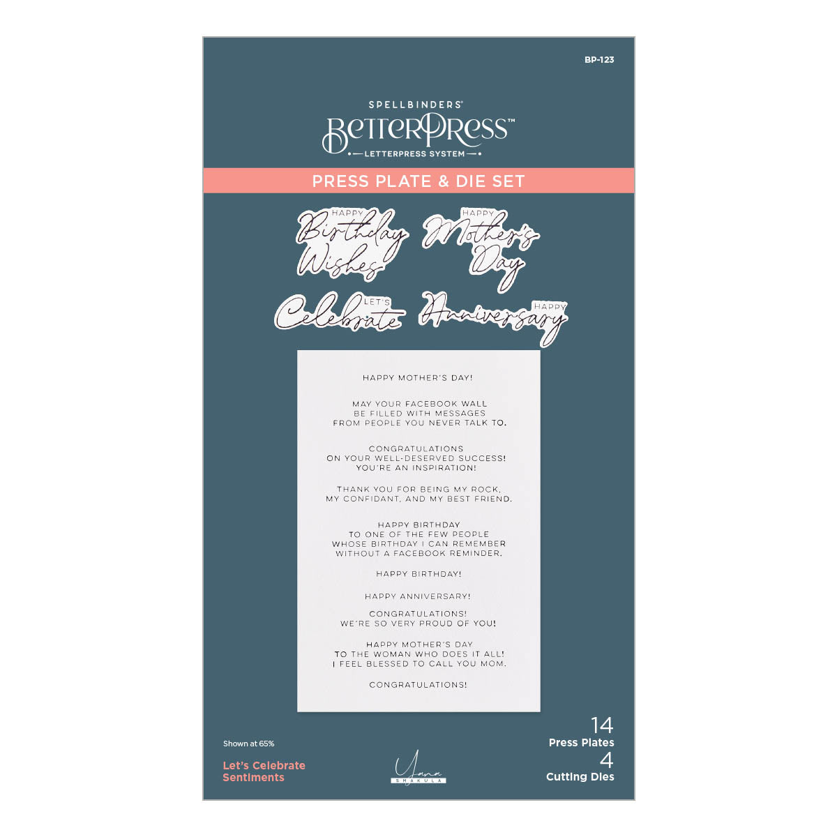 Let’s Celebrate Sentiments Press Plate & Die Set is part of the Let’s Celebrate Collection by Yana Smakula. There are 14 different occasion sentiment press plates from birthdays, anniversary, and even Mother’s Day! The four thin metal cutting dies coordinate with the larger sentiments to cut and highlight. A wonderful set to have for your cardmaking creations! Ink the plates with the BetterPress Ink to be pressed against the BetterPress Cotton Card Panel and Sheets for a crisp letterpress design.