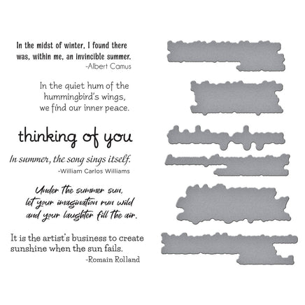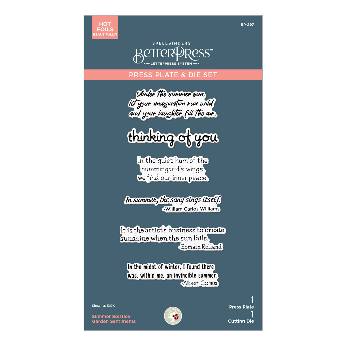 Summer Solstice Garden Sentiments BetterPress Plate & Die Set is part of the Summer Solstice Garden Collection by Susan Tierney-Cockburn. This plate impresses six different phrases that celebrate the Summer Solstice. It is a one and done set featuring a thin metal die that cuts all the sentiments at once! Ink the plates with the BetterPress Ink to be pressed against the BetterPress Cotton Card Panel and Sheets for a crisp letterpress design.