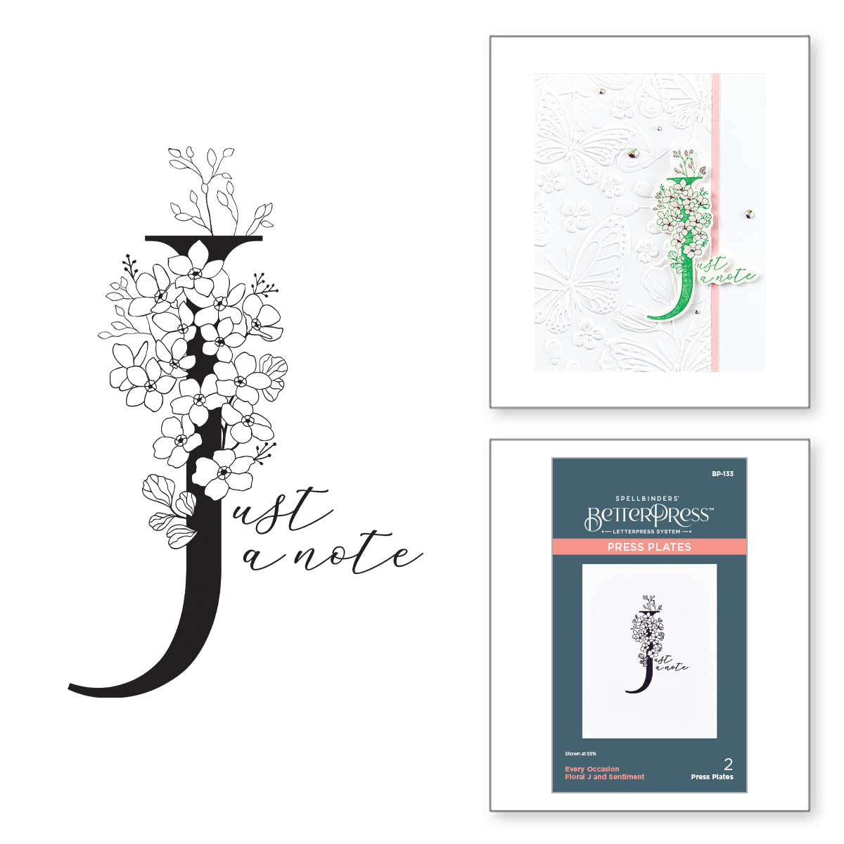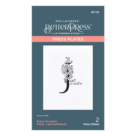 Floral J and Sentiment Press Plate is part of the Every Occasion Floral Alphabet Collection and includes two press plates. The largest plate is a stunning contemporary uppercase J font accented with floral details. The second plate compliments the letter with a sentiment, (J)ust a note. Ink the plates with the BetterPress Ink to be pressed against the BetterPress Cotton Card Panel and Sheets for a crisp letterpress design.