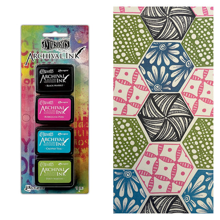 Mini Dylusions Archival Ink Pads are waterproof acid- free dye inks featuring the classic Dylusions color palette in the same fade resistant formula used in Ranger Archival Ink. Archival Inks are permanent on many surfaces providing long lasting detailed stamping results that won't bleed when used with water-based inks, markers, acrylic paint and watercolors. Ink Pads can easily be reinked with coordinating Dylusions Archival Ink Re-inkers. The small size makes these ideal for craft projects on the go and they can be stored in the Mini Archival Ink Storage Tin. 4 pieces, pads measure 1.25" x 1.75" (3.12 cm x 4.45 cm)