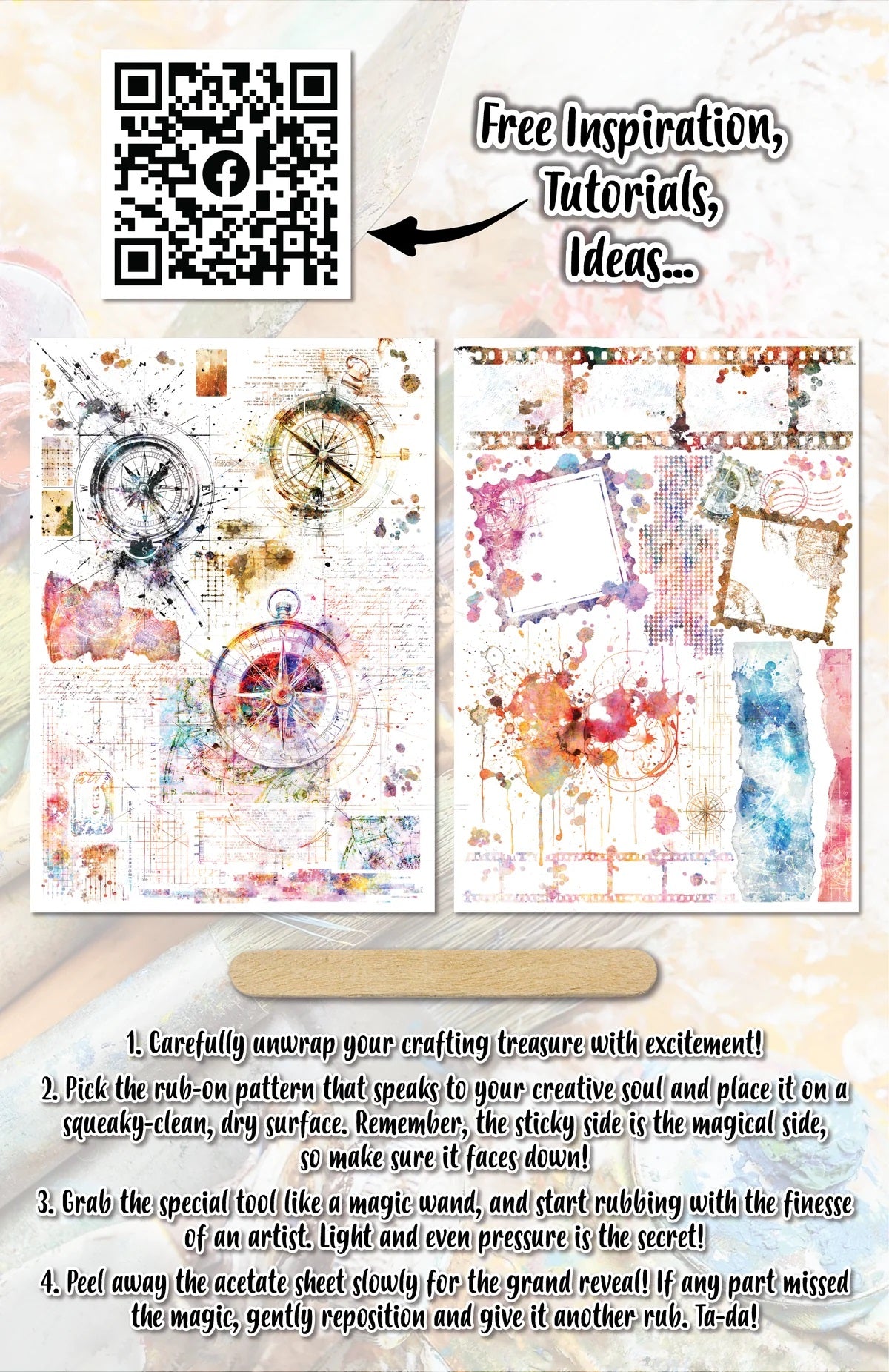 Rub-on pack includes 2x A5 sheets and a user-friendly applicator for effortless results on diverse surfaces such as paper, furniture, wood, glass, porcelain, and more... The perfect add for all kinds of craft projects.