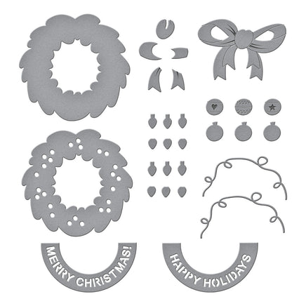 Classic Mouse Holiday Wreath Etched Dies are part of the Say Cheese Classic Mouse Christmas Collection by Simple Stories. Create a wonderful holiday wreath with this set of 14 thin metal cutting dies! Whether you prefer a lighted wreath, one decked with ornaments, or just a sweet sentiment, this set allows you to customize just the way you like! Once you've chosen your perfect style, finish it off with a big bow! This set also coordinates perfectly with S6-261 Steamboat Willie Duo Dies to add a favorite friend to the center, or with S5-703 Classic Mouse Alphabet Dies to monogram your wreath with any letter.