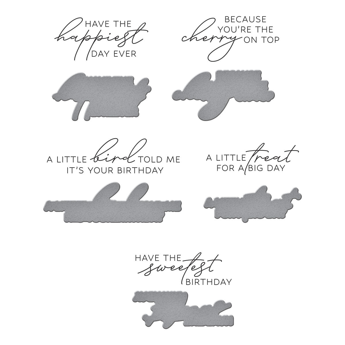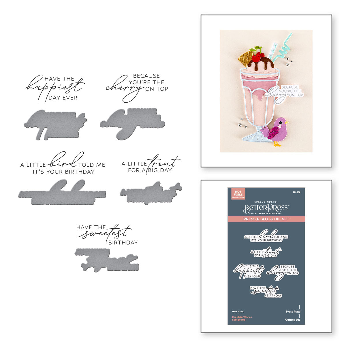 Fountain Wishes Sentiments BetterPress Plate & Die Set is from the Happier Hour Collection. Press five sentiments all at once on one press plate and die-cut the sentiments with the coordinating thin metal cutting die. A time saving set to get you started with five sentiments. With sweet treat sentiments, this set works well with S5-725 Fountain Wishes Die Set. Ink the plates with the BetterPress Ink to be pressed against the BetterPress Cotton Card Panel and Sheets for a crisp letterpress design.