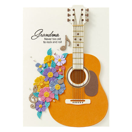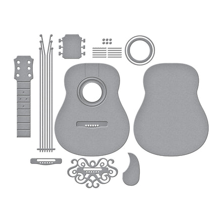 Majestic Guitar Etched Dies are part of the Bibi's Musical Notes Collection by Bibi Cameron. When assembled, this set of 11 thin metal cutting dies makes a magnificent guitar that measures approximately 3.45 x 7.00 in./8.70 x 17.80 cm. Big enough to fit an A7-size card front or larger! Make it unique guitar-shaped box by grabbing the S3-552 that includes a side panel die to make it three dimensional.