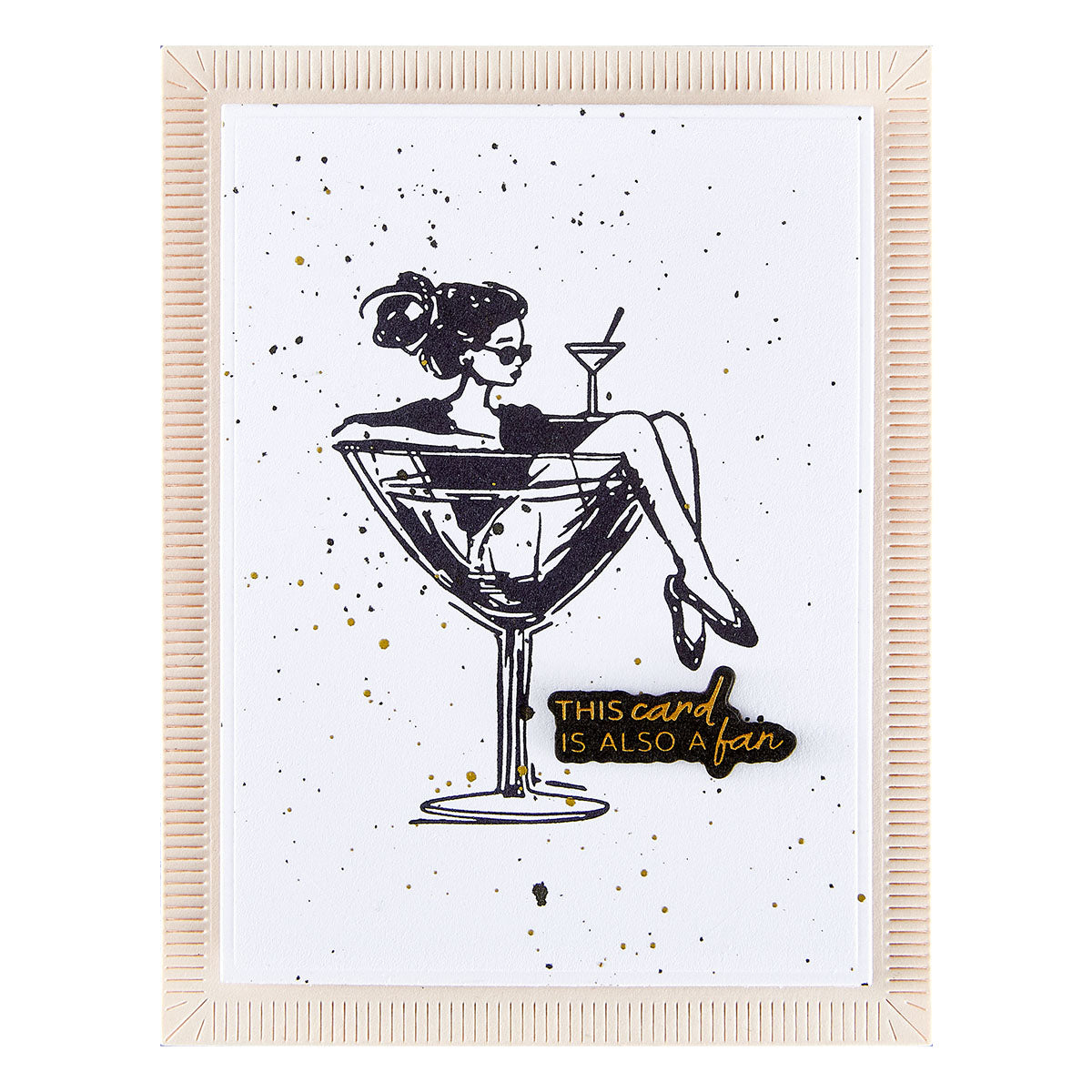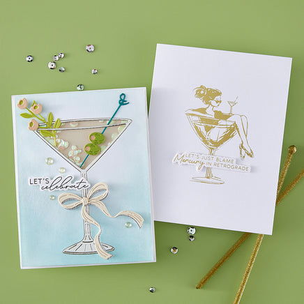Martini Mood BetterPress Plate & Die Set is part of the Happier Hour Collection. Press seven sentiments at once with one press plate and then die-cut them with the coordinating thin metal cutting die. A time saving set to get you started with seven sentiments. The second plate and its matching die cuts a girl sipping a cocktail while resting inside a martini glass. Works well with S4-1372 Olive Martinis Etched Dies. Ink the plates with the BetterPress Ink to be pressed against the BetterPress Cotton Card Panel and Sheets for a crisp letterpress design.