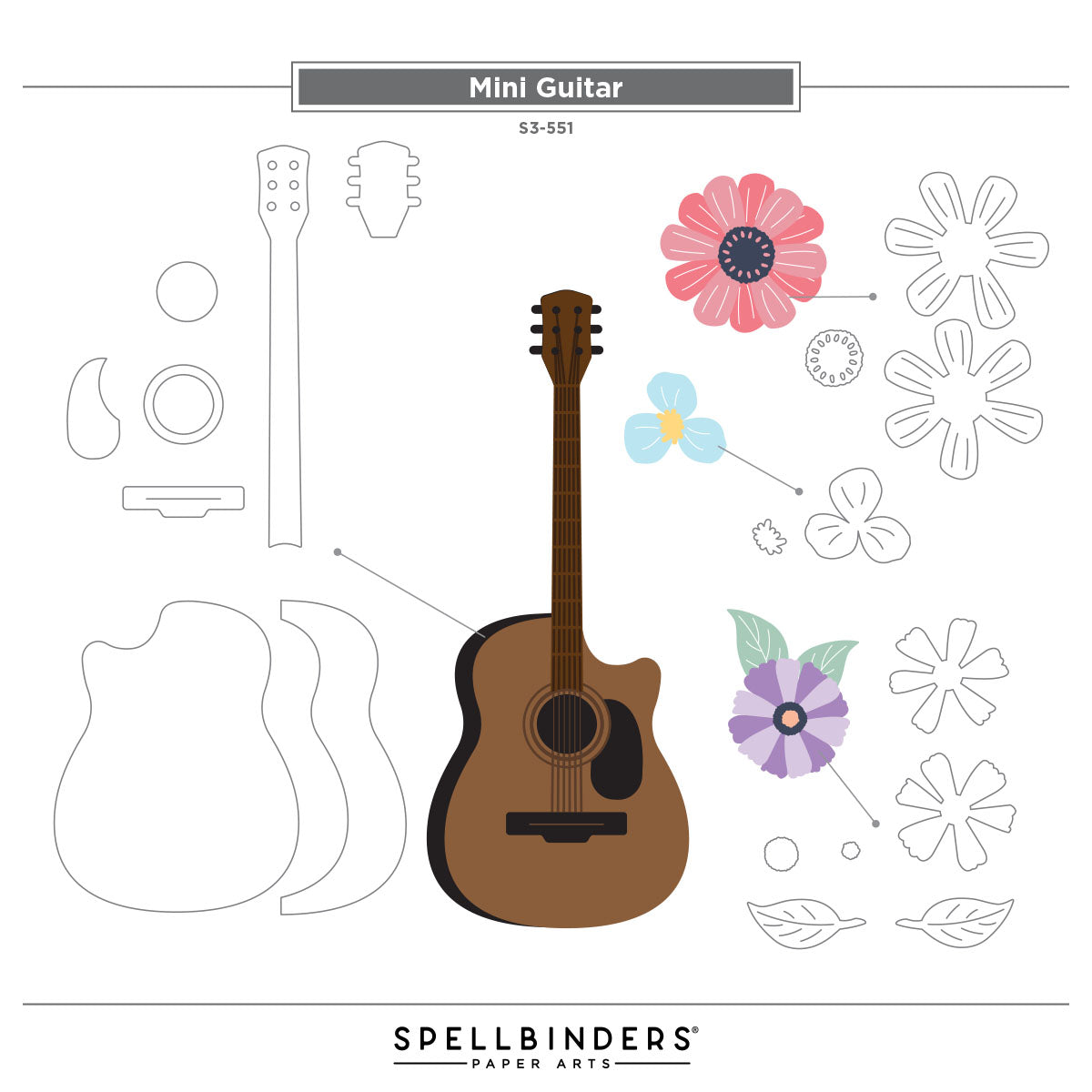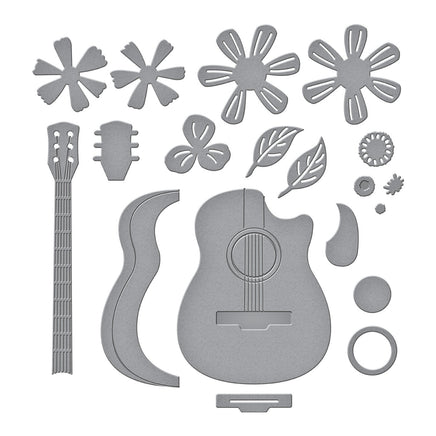 Mini Guitar Etched Dies are part of the Bibi's Musical Notes Collection by Bibi Cameron. When assembled, this set of 11 thin metal cutting dies makes an amazing guitar, along with floral accents to make it even lovelier!