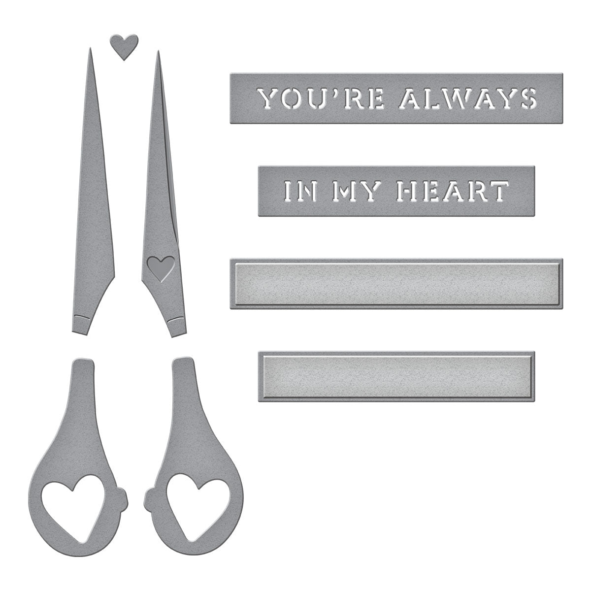 This set of six thin metal dies creates an adorable pair of scissors with heart shaped finger grips. Two sentiment strips create the tribute message "You're Always In My Heart." A portion of the proceeds from each sale will be donated to the American Heart Association in Sharon's honor.