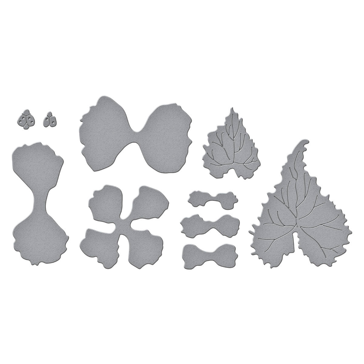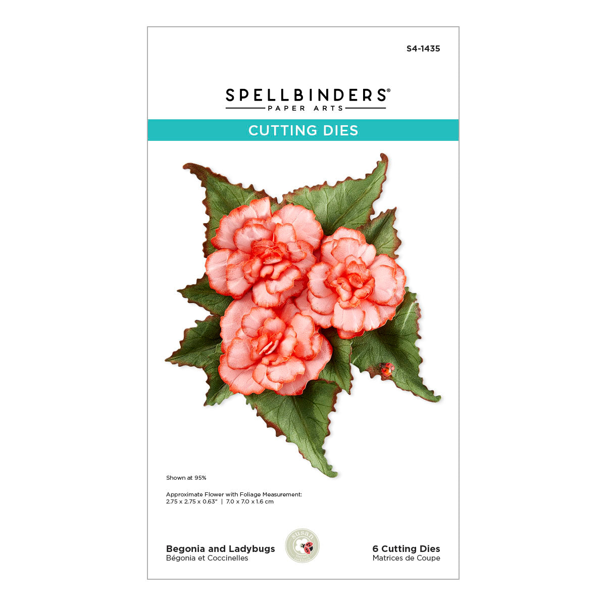 Begonia and Ladybugs Etched Dies are from the Summer Solstice Garden Collection by Susan Tierney-Cockburn. When assembled, the set of six thin metal cutting dies makes a beautiful Begonia flower and includes Susan’s signature sweet ladybug design.The finished flower with foliage measures approximately 2.75 x 2.75 x 0.63 in./7.00 x 7.00 x 1.60 cm.