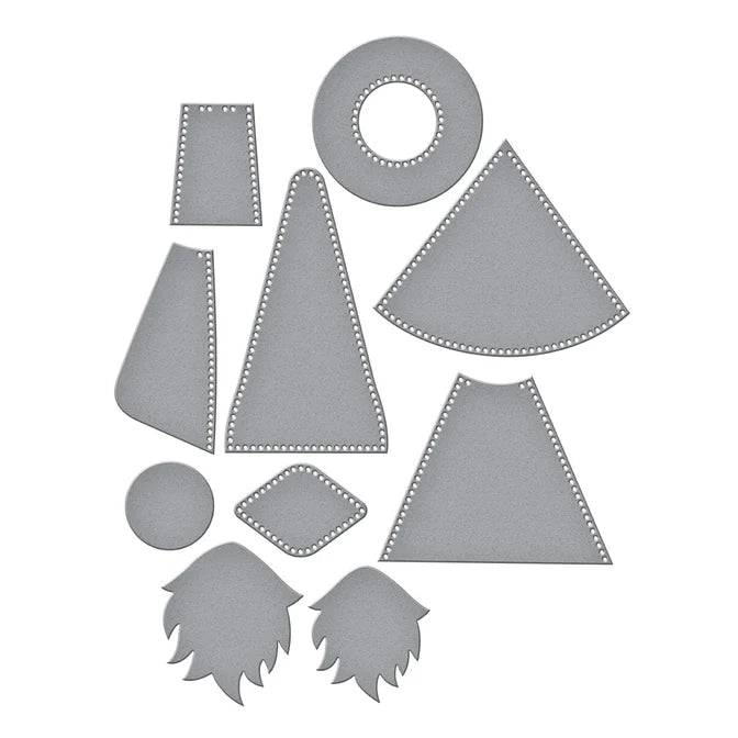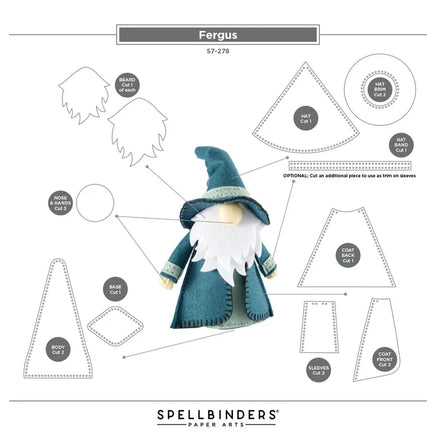 Fergus Etched Dies are part of the 3D Felt Décor Collection by Sandi MacIver. When assembled, this set of 11 thin metal cutting dies makes a wonderful dimensional Gnome! Detailed stitching design on the edges gives a wonderful, finished look and creates a guide for stitching the gnome together. Cut with our Merino Wool Felt Sheets sets to bring it to life in texture and dimension or cut in paper for an entirely different look. For more interest, add sweet tiny buttons from our embellishment section! The finished Fergus measures approximately 3.75 x 6.25 x 1.75 in./9.50 x 15.90 x 4.50 cm.