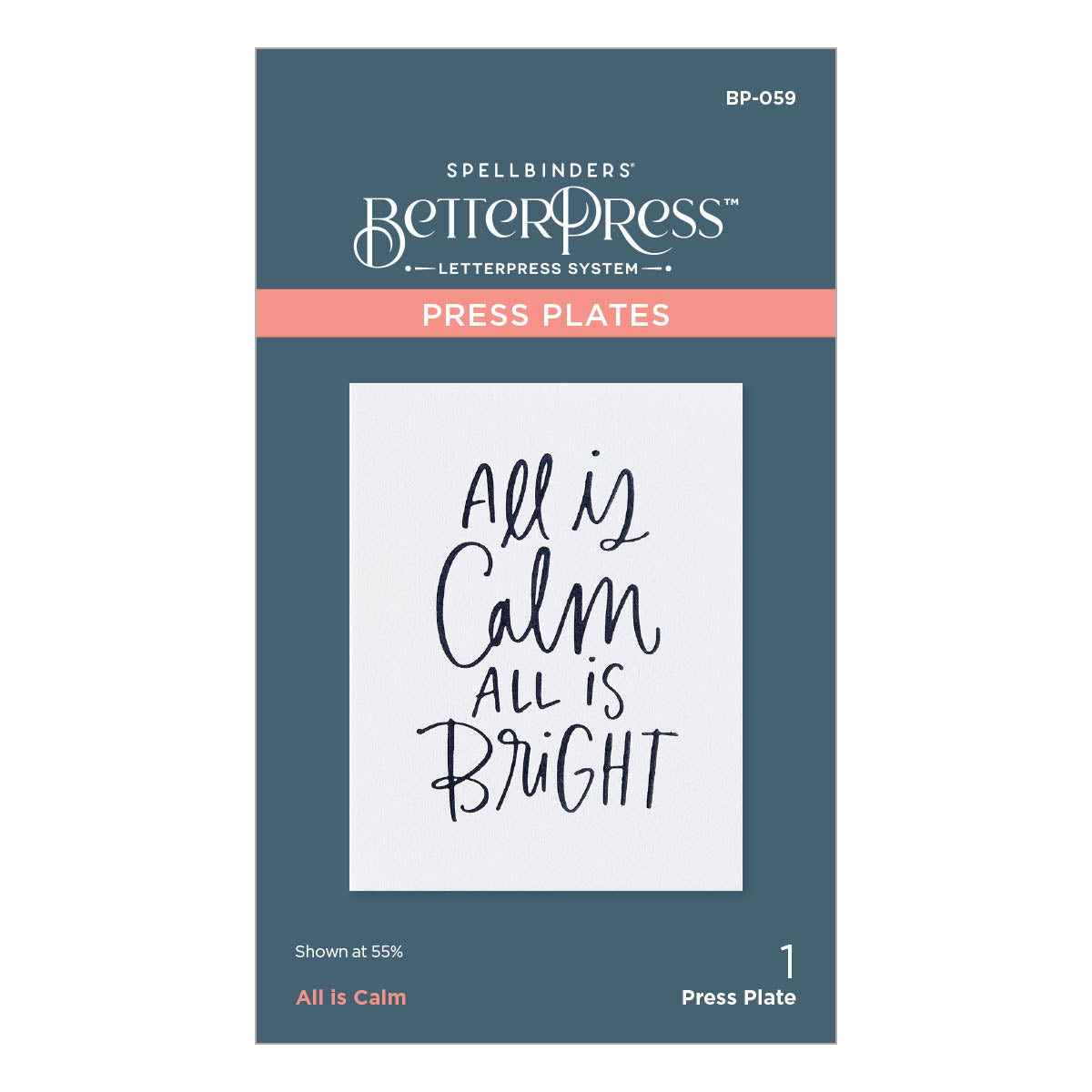All is Calm Press Plate is from the More BetterPress Christmas Collection. The press plate is designed in a handwritten sentiment of All is Calm All is Bright covers an entire standard A2 size card front and makes a magical focal point. Ink the plates with the BetterPress Ink to be pressed against the BetterPress Cotton Card Panel and Sheets for a crisp letterpress design.