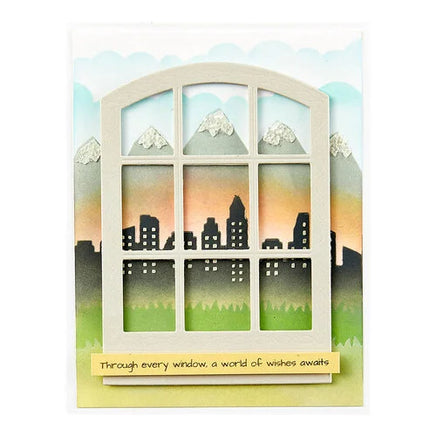 Windows with a View is a collection of wonderful scenery one can observe through a window. There are scene sets, clear stamp sentiments and a background stencil that enhances the S5-626 Vista View Window set. What do you see out your window?