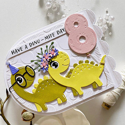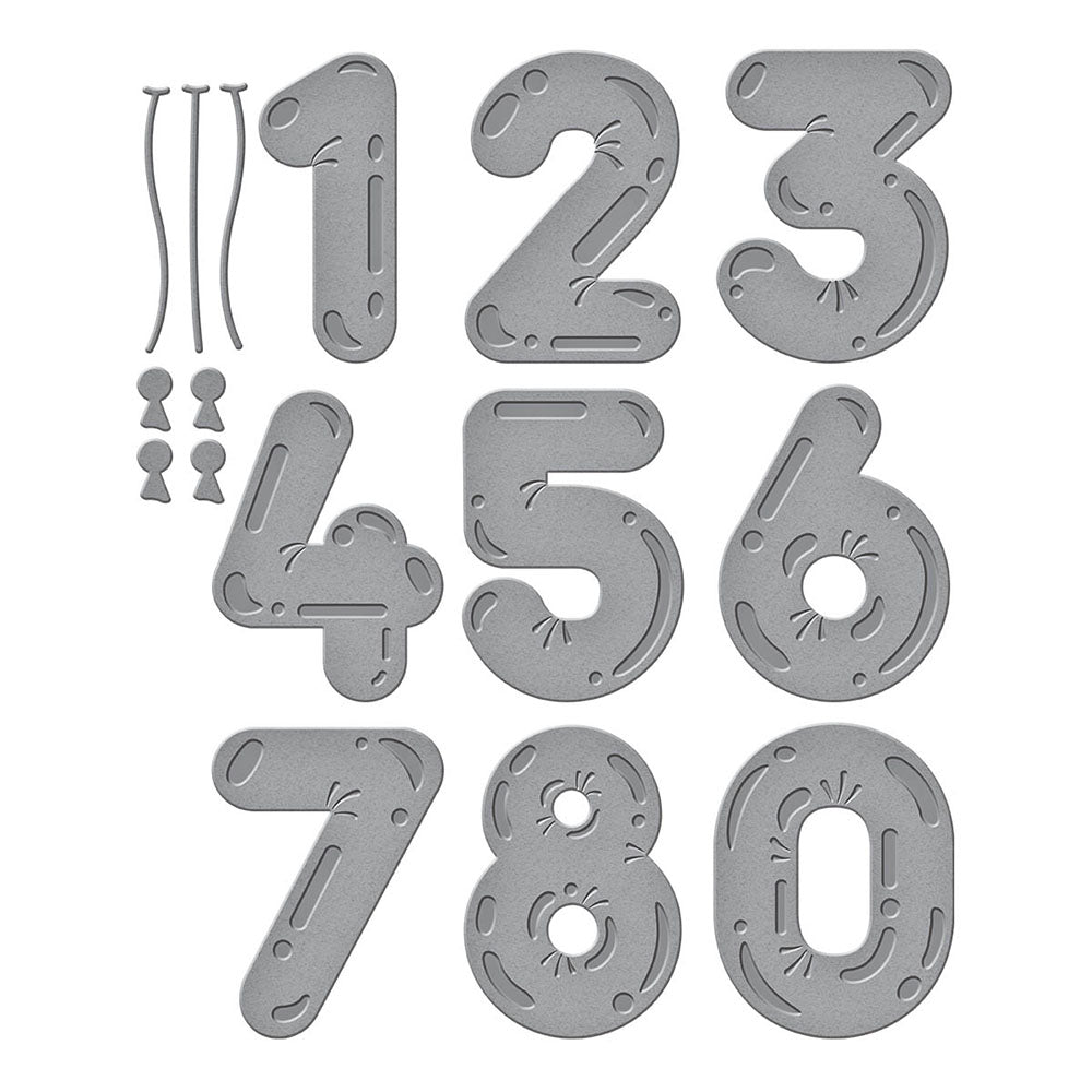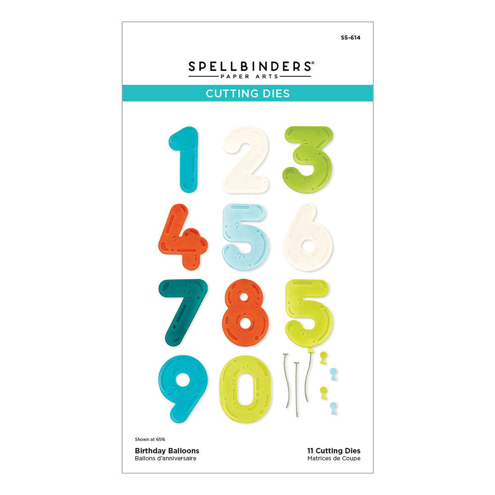Birthday Balloons Etched Dies is from the Monster Birthday Collection and a fun assembly of numbered balloons. There are 11 thin metal cutting dies to help make a complete balloon from the number to the knot to the string. A wonderful set to have any milestone occasions like anniversary, graduation and more!