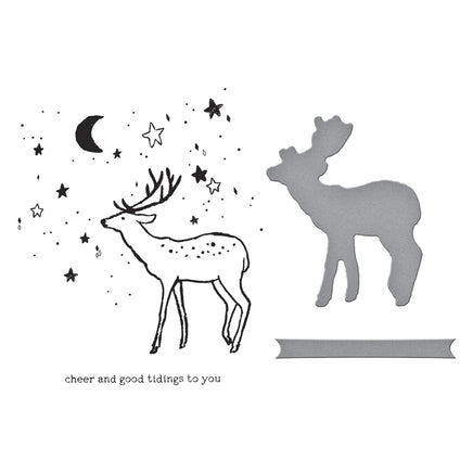 Cheer and Good Tidings Deer Registration Press Plate & Die Set is from the Starry Holiday Collection by Dina Wakley. The set of four press plates, two thin metal cutting dies, and one mylar printed registration template come together to create a deer enjoying the outdoor night scene with the stars and crescent moon to boot! Use the registration template to make a card with all the plates, or use each plate on it's own for endless style choices. The best part? Many of the plates can be used all year long! The full design measures approximately 4.44 x 3.87 in./11.30 x 9.80 cm.