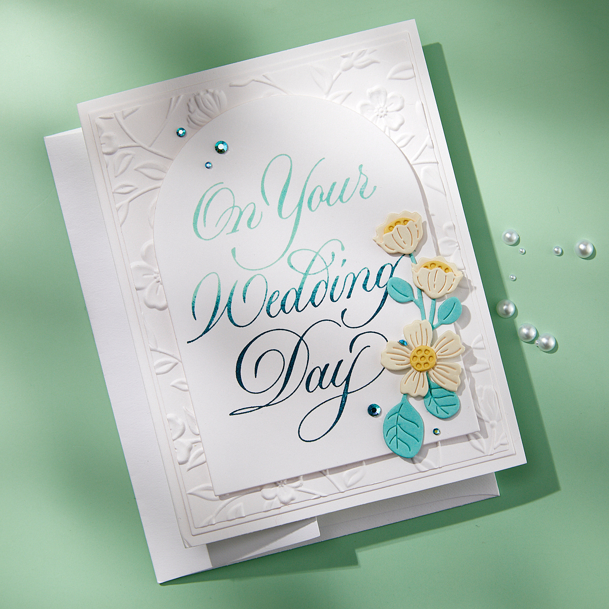 Copperplate On Your Wedding Day BetterPress Plate is from the Copperplate On Your Wedding Day Collection by Paul Antonio. This plate presses On Your Wedding Day in an elegant Copperplate script onto your creation, and perfect for the occasion! Ink the plates with the BetterPress Ink to be pressed against the BetterPress Cotton Card Panel and Sheets for a crisp letterpress design.