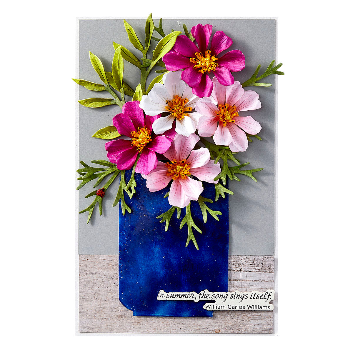 Cosmos Etched Dies are from the Summer Solstice Garden Collection by Susan Tierney-Cockburn. Assembled, this set of six thin metal cutting dies makes an adorable Cosmos flower. The finished flower with foliage measures approximately 2.75 x 2.50 x 0.75 in./7.00 x 6.40 x 1.90 cm.