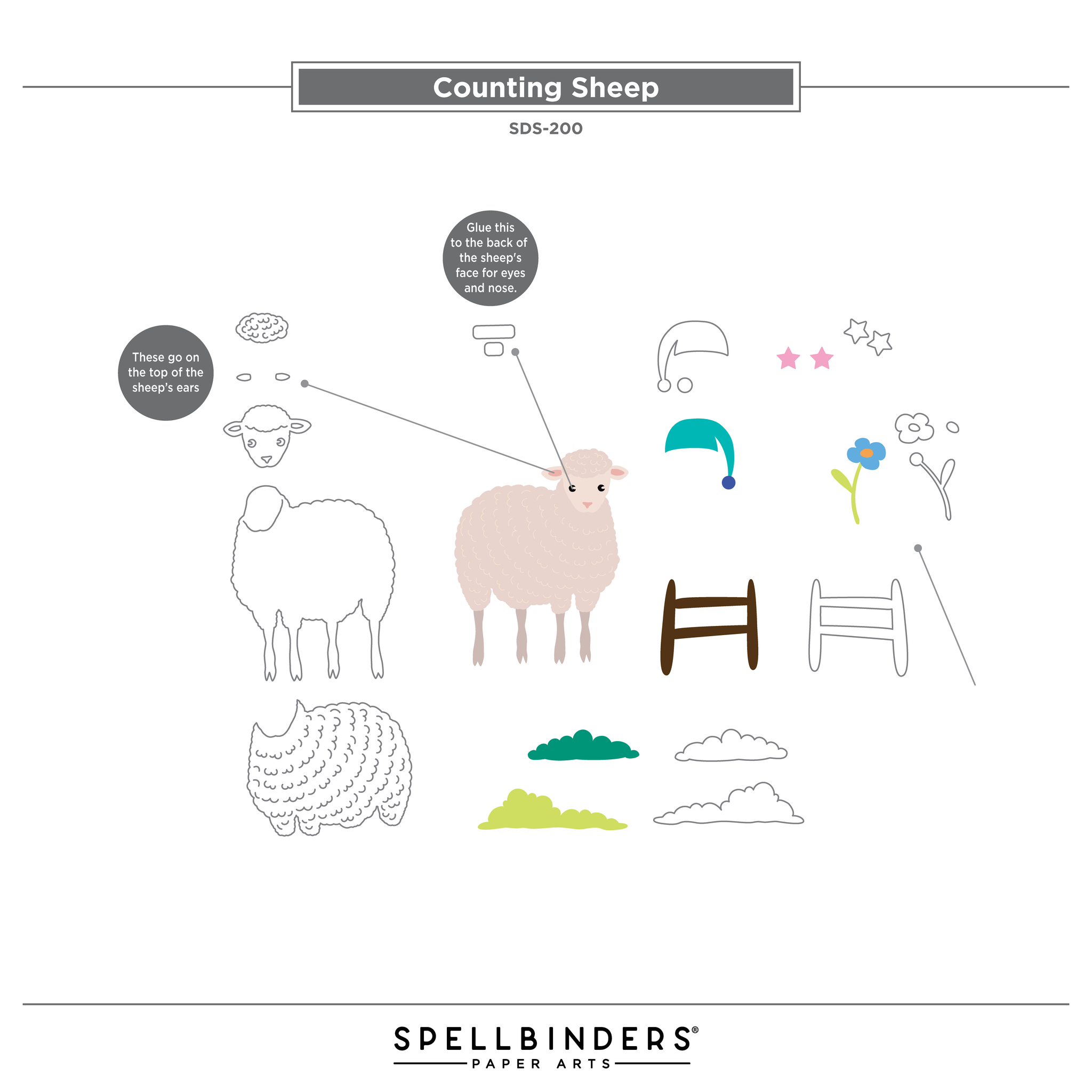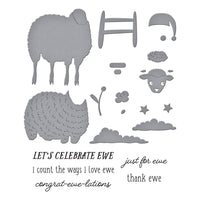 Counting Sheep Clear Stamp & Die Set is part of the On the Farm Collection. This cute set of 12 thin metal cutting dies creates a sheep and her surroundings! Accessories the sheep with a cap, flowers, stars, fence and stars designs. Add in the four punny clear stamp phrases included in this set and cards come together in a flash with the perfect matching sentiment. Stamps include: Congrat-ewe-lations, Thank Ewe, Let's Celebrate Ewe, Just for Ewe and I Count the Ways I Love Ewe. Assembled Sheep measures approximately 1.78 x 2.37 in./4.50 x 6.00 cm and assembled Sheet with Fence and Landscape measures 2.92 x 2.47 in./7.40 x 6.40 cm.