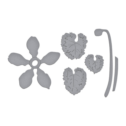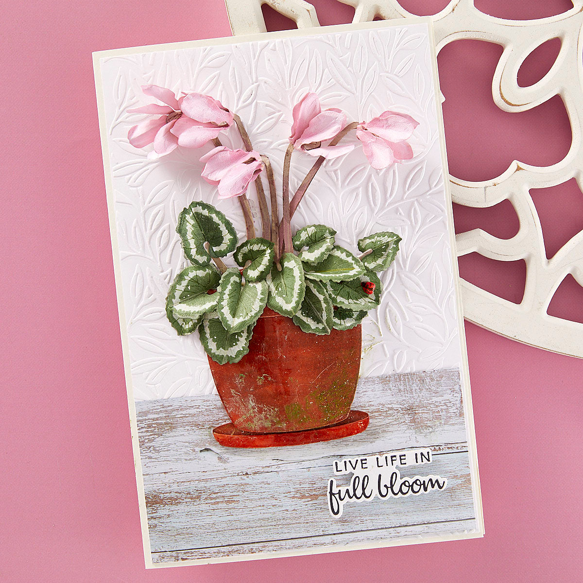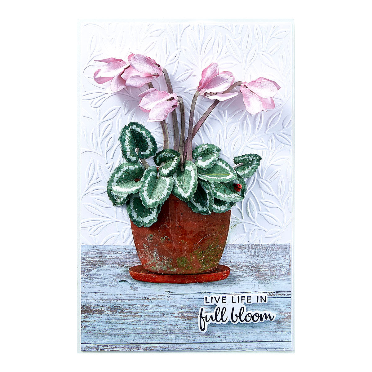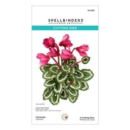 Cyclamen Etched Dies are from the Winter's Grace Garden Collection by Susan Tierney-Cockburn. Create a sweet bunch of Cyclamen with this set of three thin metal cutting dies. The small flowering plant is known for its lovely backward-curving petals. Approximate Finished Flowers with Foliage measures 1.00 x 4.50 x 5.50 in./23.50 x 11.40 x 14.00 cm.