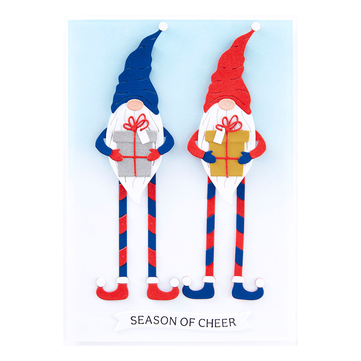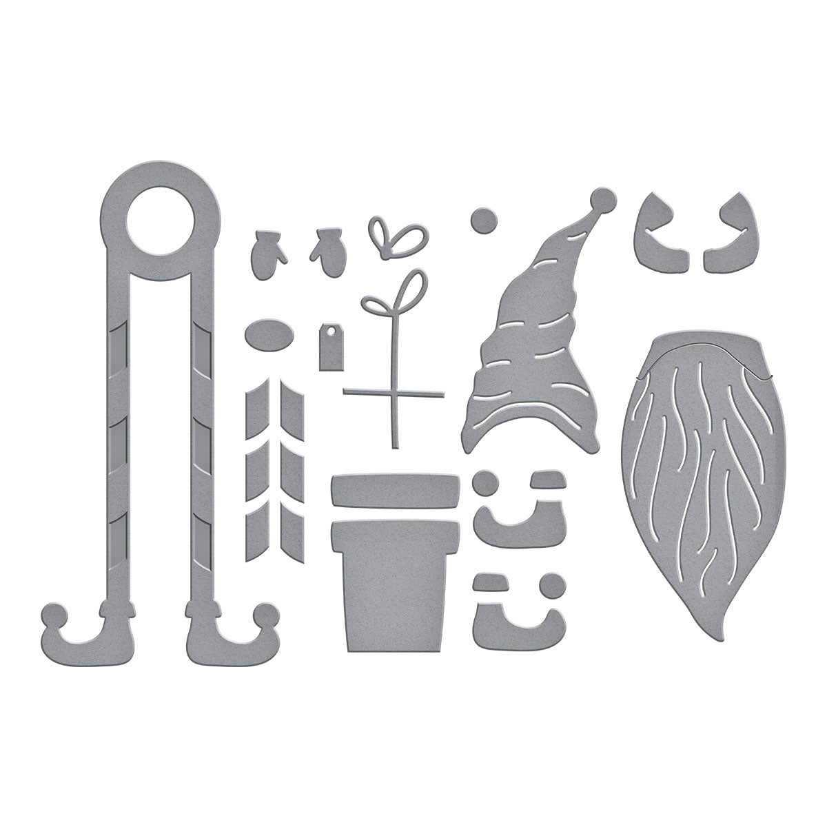 Dancin’ Gnome Alfie Etched Dies is from the Dancin' Christmas Friends Collection with a set of 10 thin metal cutting dies. When assembled, it creates a super fun gnome with moving legs that swing back and forth. He is one tall gnome measuring almost 6 inches tall! There are other fun accessories in the set to give him the perfect look!