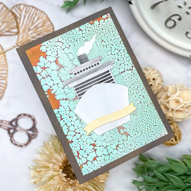 Deckside Dreams Etched Dies are part of the La Dolce Vita Collection. When assembled, this set of eight thin metal cutting dies makes a luxurious ocean cruiser with all the details you can imagine. It even has a smoke stack!