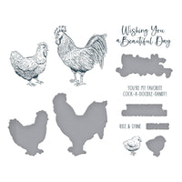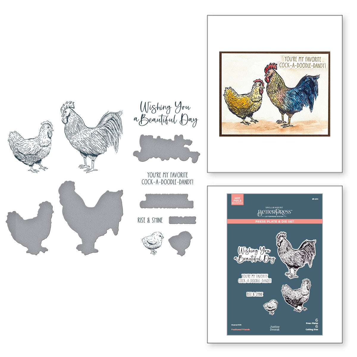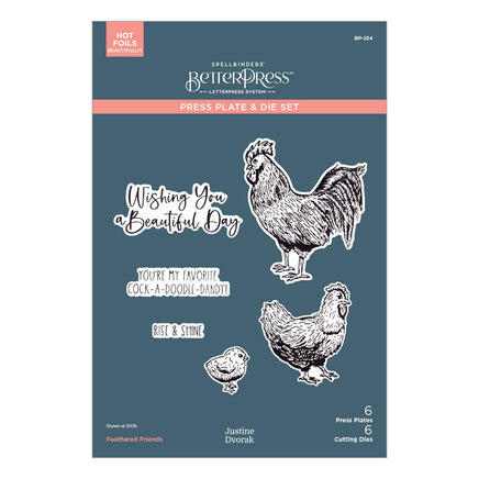 Feathered Friends BetterPress Plate & Die Set is part of the Justine's Farm Collection by Justine Dvorak. Letterpress a flock of hens, roosters and chicks, along with three playful sentiments: Wishing You a Beautiful Day, You’re my Favorite Cock-A-Doodle-Dandy, and Rise & Shine. Each chicken and sentiment includes a matching die to allow you to pop them up on a card or scrapbook page. Ink the plates with the BetterPress Ink to be pressed against the BetterPress Cotton Card Panel and Sheets for a crisp letterpress design.