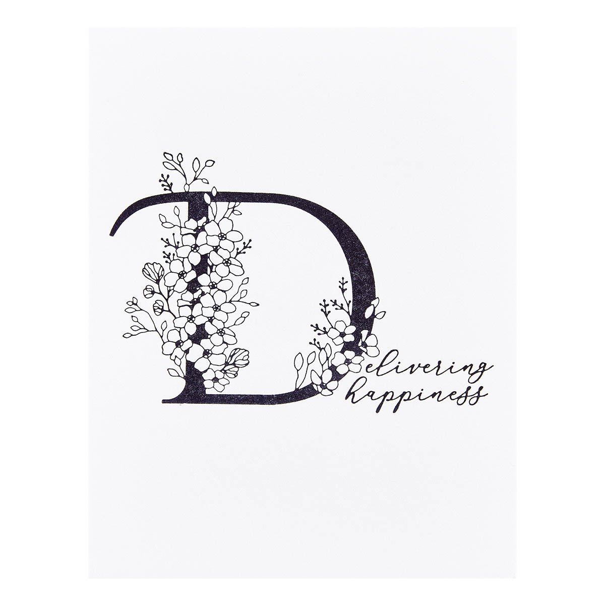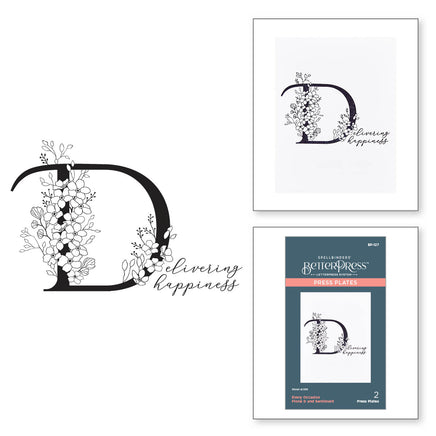 Floral D and Sentiment Press Plate is part of the Every Occasion Floral Alphabet Collection and includes two press plates. The largest plate is a stunning contemporary uppercase D font accented with floral details. The second plate compliments the letter with a sentiment, (D)elivering happiness. Ink the plates with the BetterPress Ink to be pressed against the BetterPress Cotton Card Panel and Sheets for a crisp letterpress design.