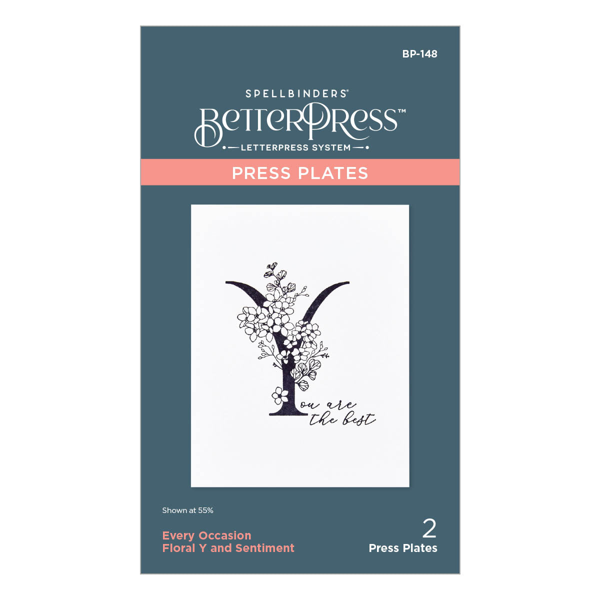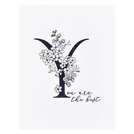 Floral Y and Sentiment Press Plate is part of the Every Occasion Floral Alphabet Collection and includes two press plates. The largest plate is a stunning contemporary uppercase Y font accented with floral details. The second plate compliments the letter with a sentiment, (Y)ou are the best. Ink the plates with the BetterPress Ink to be pressed against the BetterPress Cotton Card Panel and Sheets for a crisp letterpress design.