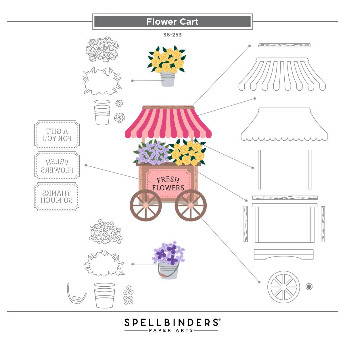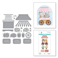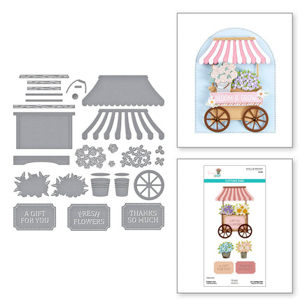 Flower Cart Etched Dies are part of the Simple Vintage Flower Shoppe Collection designed in collaboration with Simple Stories. Don't be fooled by the impressiveness of this beautiful die set- it's deceptively easy to put together! This charming striped cart and its bunches of flowers layer up perfectly for a complex look created with just a few pieces. When assembled, this set of 20 thin metal cutting dies creates a stunning and detailed roofed flower cart complete with bouquets, flower buckets and more! Also included are three sentiments: Fresh Flowers, A Gift for You, and Thanks So Much that can be placed on the cart’s front panel. The finished flower cart measures approximately 3.65 x 4.90 in./9.30 x 12.40 cm and the flower bucket measures 1.40 x 1.65 in./3.50 x 4.10 cm.