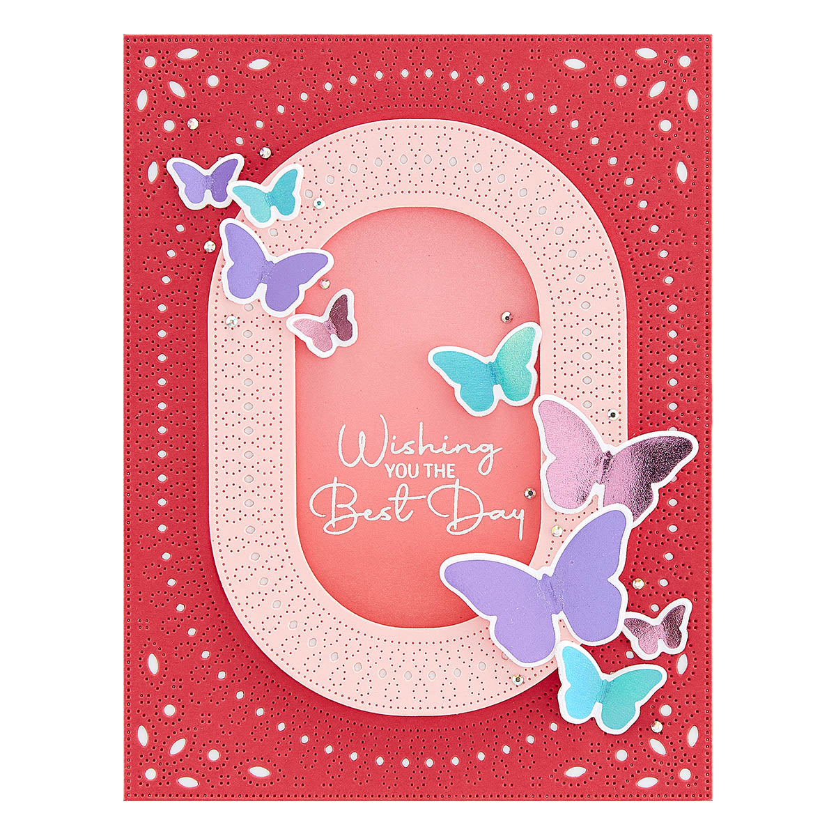 Fluttering By Glimmer Hot Foil Plate & Die Set from Stylish Ovals Collection is full of fluttering butterflies in action on a wide border design. Foil one side for a border or cover the entire surface for a sweet background of butterflies! There are four thin metal cutting dies to cut butterflies to layer or add dimension to the motif. So fun!