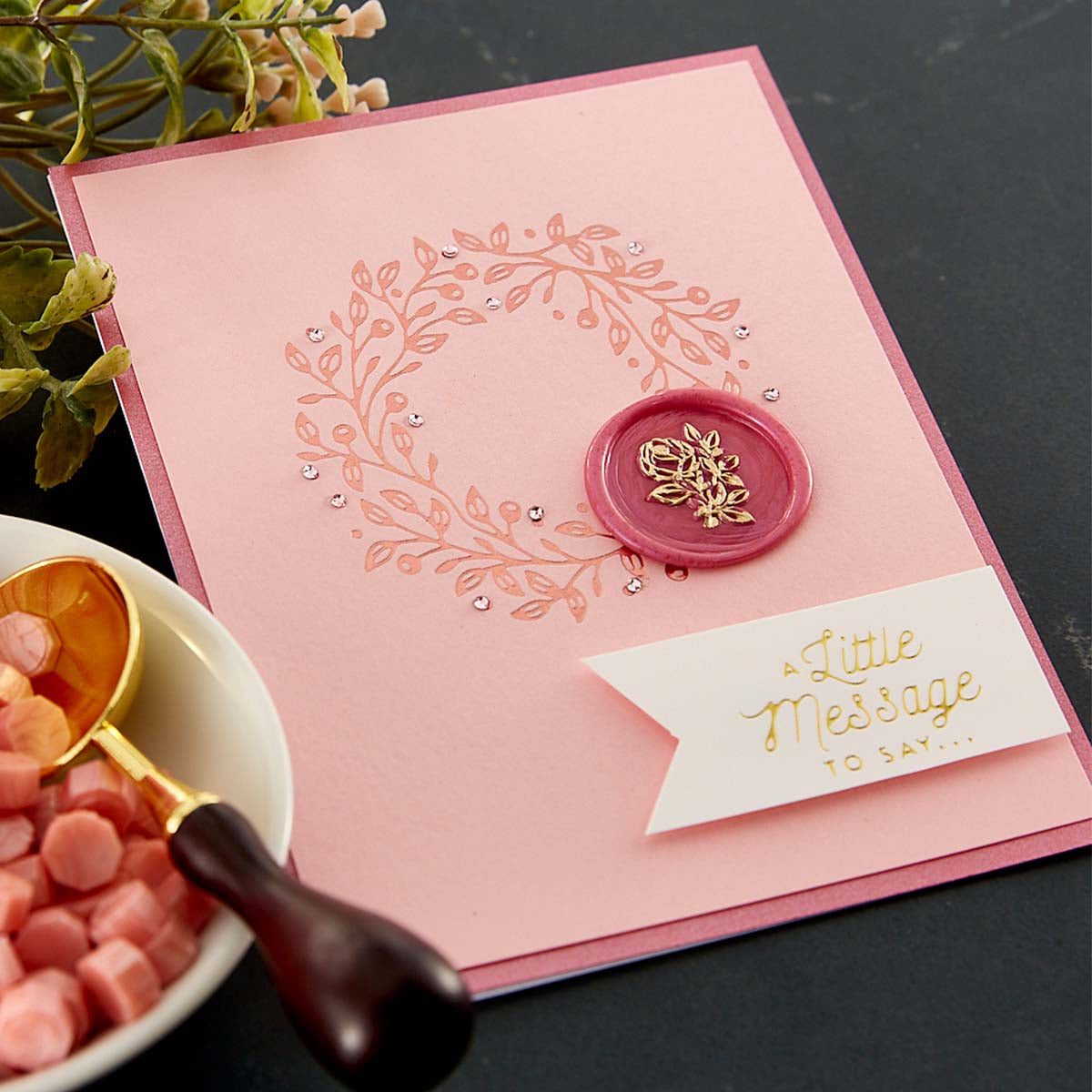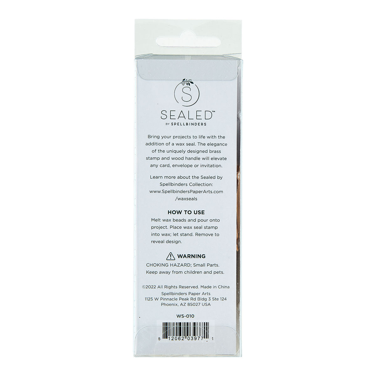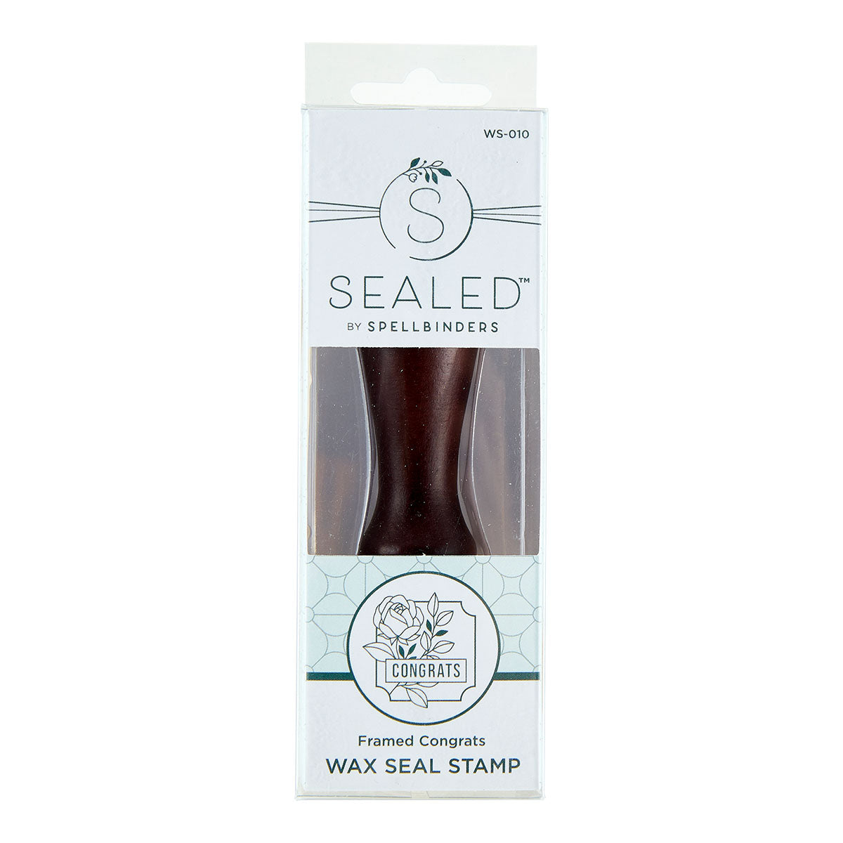 Framed Congrats Wax Seal Stamp is part of the Sealed by Spellbinders Collection. It has one wooden handle that supports a 1" round brass seal stamp design on its end. The stamp design has a clipped cornered square label in the center layered with a rose and CONGRATS on top. Add elegant and unique wax seal accents to your cards, envelopes and more!