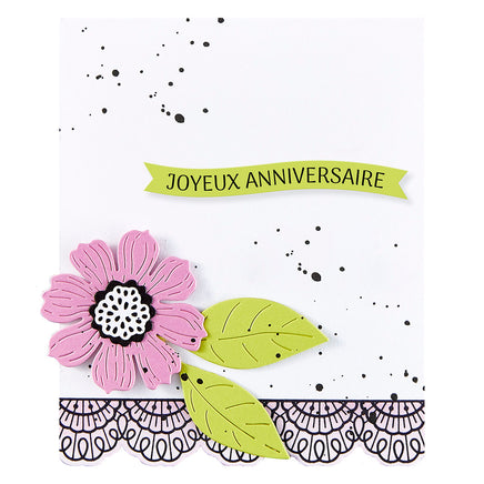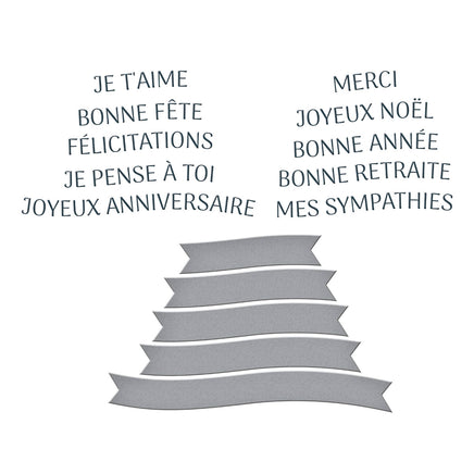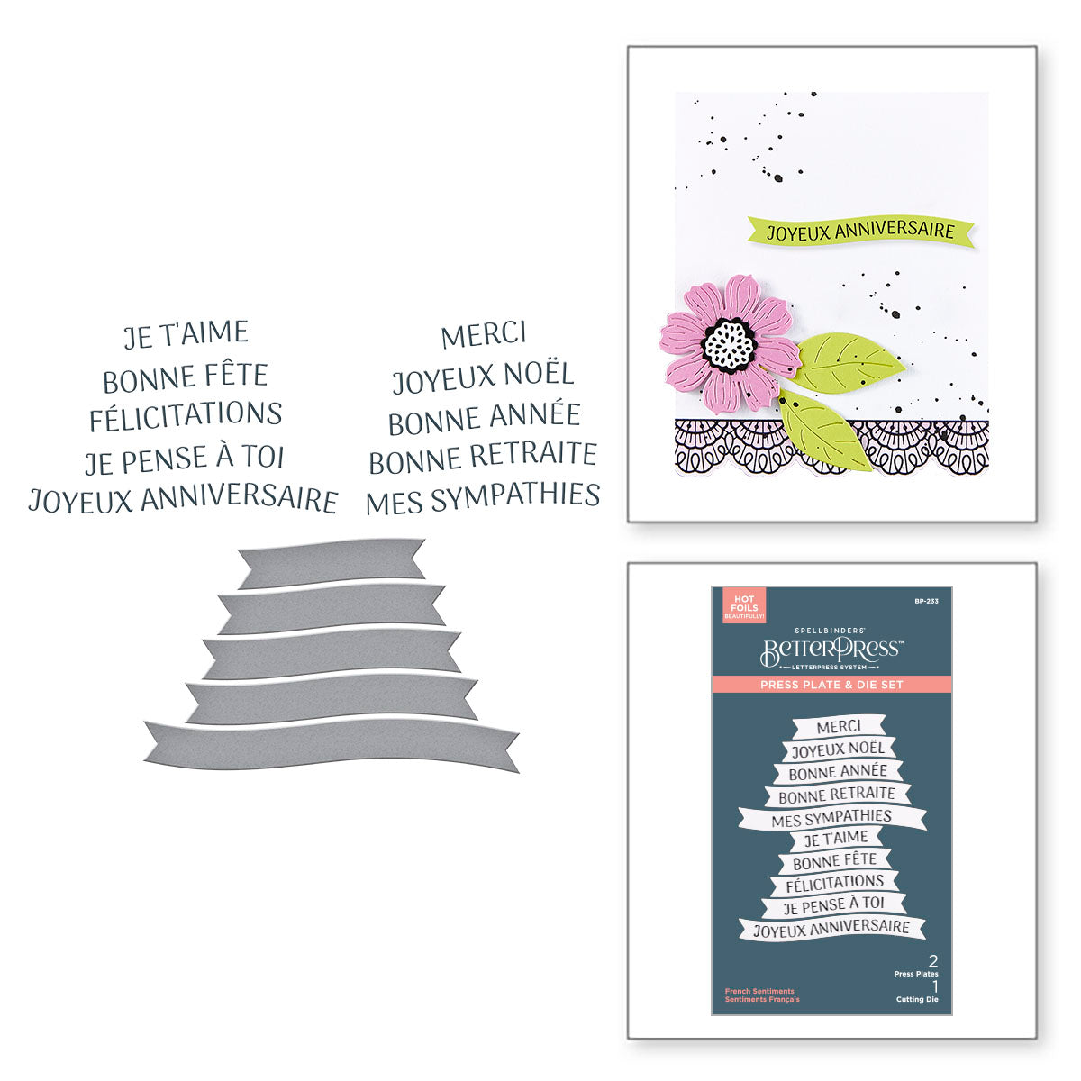 French Sentiments BetterPress Plate & Die Set is part of the International Sentiments Collection. Each of the two plates press five French sentiments at once, perfect for cutting out with the matching thin metal cutting die for a time-saving step. The sentiment strips are cut into waving ribbon-tail ends on both sides to create movement. There’s a total of 10 sentiments to choose from. The uppercase font sentiments cover many occasions such as Je t'aime/I love you, Bonne Fete /Happy Holiday, Felicitations /Congratulations, Je Pense a Toi/Thinking of You, Joyeaux Anniversaire/ Happy Birthday, Merci/Thanks, Joyeux Noel /Merry Christmas, Bonne Annee /Good Year, Bonne Retraite/Happy Retirement and Mes Sympathies /My Sympathies. Ink the plates with the BetterPress Ink to be pressed against the BetterPress Cotton Card Panel and Sheets for a crisp letterpress design.