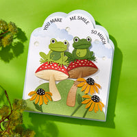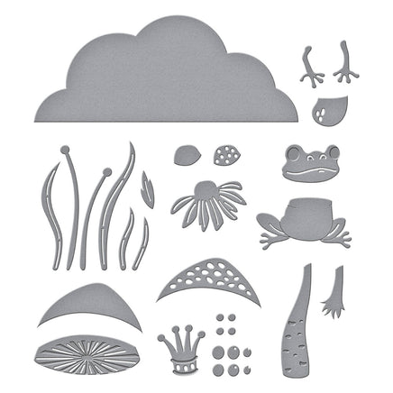 Frog Prince Etched Dies are part of the Jump for Joy Collection. Assemble this adorable frog with its crown in this set of 18 thin metal cutting dies! It includes many scenes from a mushroom cap, grassy grounds to a field of flowers…even a cloudy backdrop.