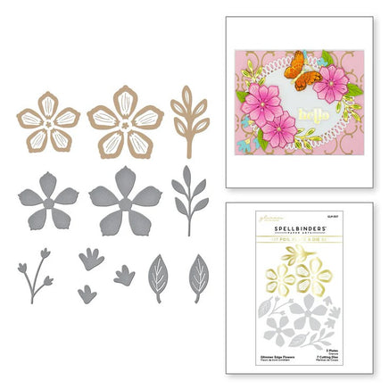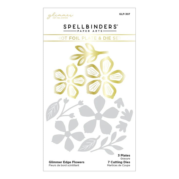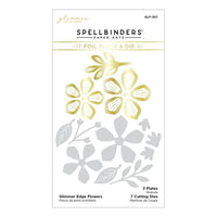Glimmer Edge Flowers Glimmer Hot Foil Plate & Die Set is part of the Spring into Glimmer Collection. Give these sweet flowers a stunning accent of foil on their edges, veins and centers. This set of three plates includes two sizes of the five-petal flower and a leaf sprig. The seven thin metal dies cut those shapes, along with a blossom sprig, three tiny flowers, and two small leaves.