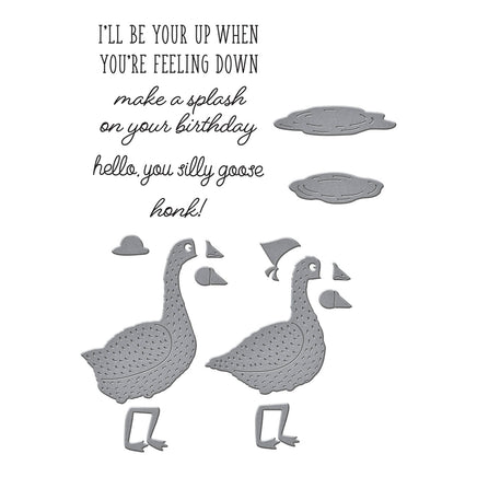 Honk Honk Clear Stamp & Die Set is part of the On the Farm Collection. This lovely set of eight thin metal cutting dies creates two geese with a hat and kerchief, plus two puddle designs. Add in the four punny clear stamp phrases included in this set and cards come together in a flash with the perfect matching sentiment. Stamps include: I’ll Be Your Up When You’re Feeling Down, Make a Splash on Your Birthday, Honk! and Hello, You Silly Goose. Assembled Geese in Puddles measures approximately 2.59 x 2.31 in./6.60 x 5.90 cm.