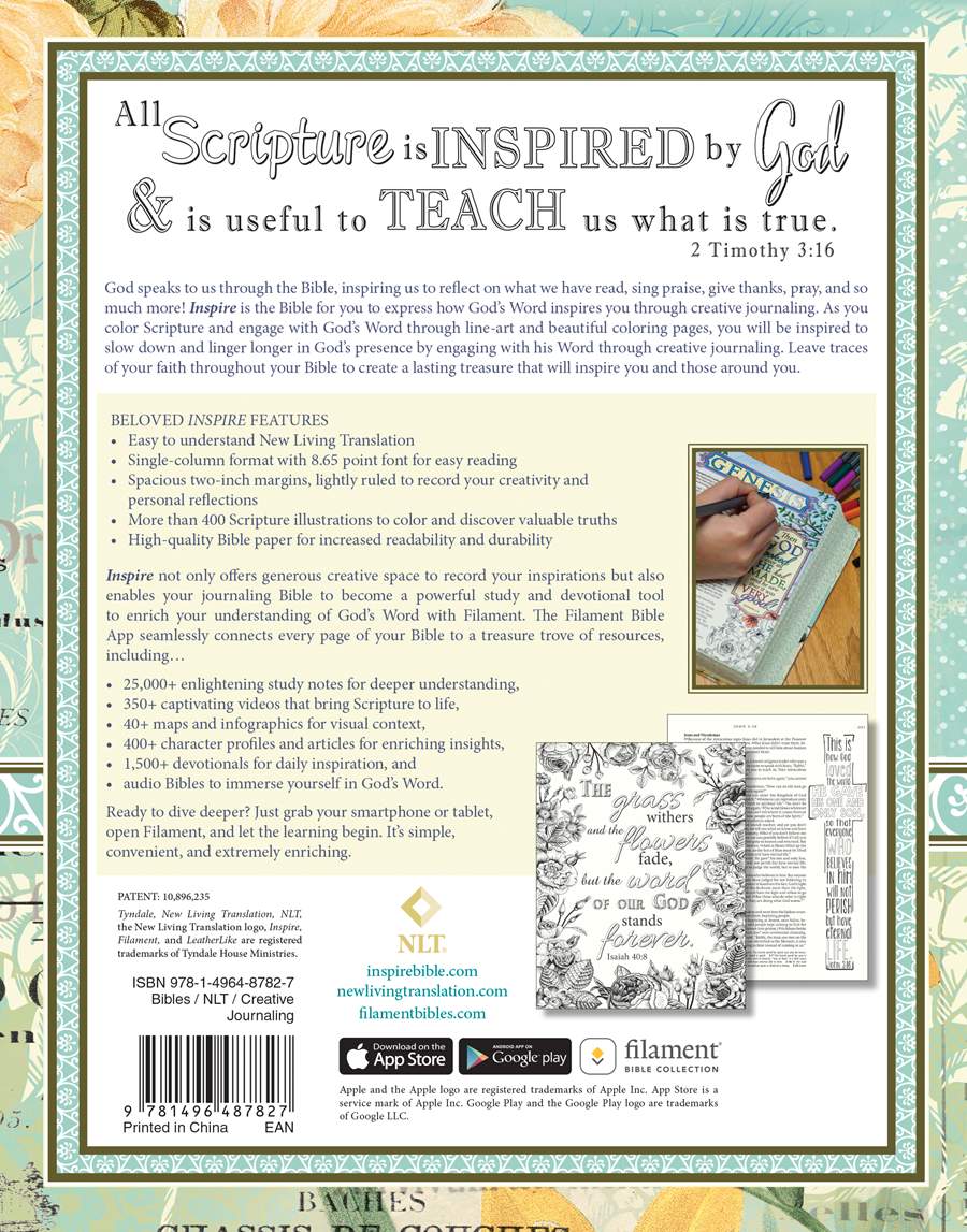 Inspire is a single-column, wide-margin New Living Translation Bible that will be a cherished resource for coloring and creative art journaling. It’s the first Bible of its kind—with over 400 beautiful line-art illustrations spread throughout the Bible. Full-page and partial-page Scripture art is attractively displayed throughout the Bible, and the illustrations can be colored in to make each Bible unique, colorful, and customizable. Every page of Scripture has two-inch-wide margins, with either Scripture line-art or ruled space for writing notes and reflections, or to draw and create. The generous 8.65-point font ensures optimal readability, and quality cream Bible paper is great for creative art journaling. Inspire is available in the popular New Living Translation, and is designed uniquely to appeal to art-journaling and adult coloring book enthusiasts.