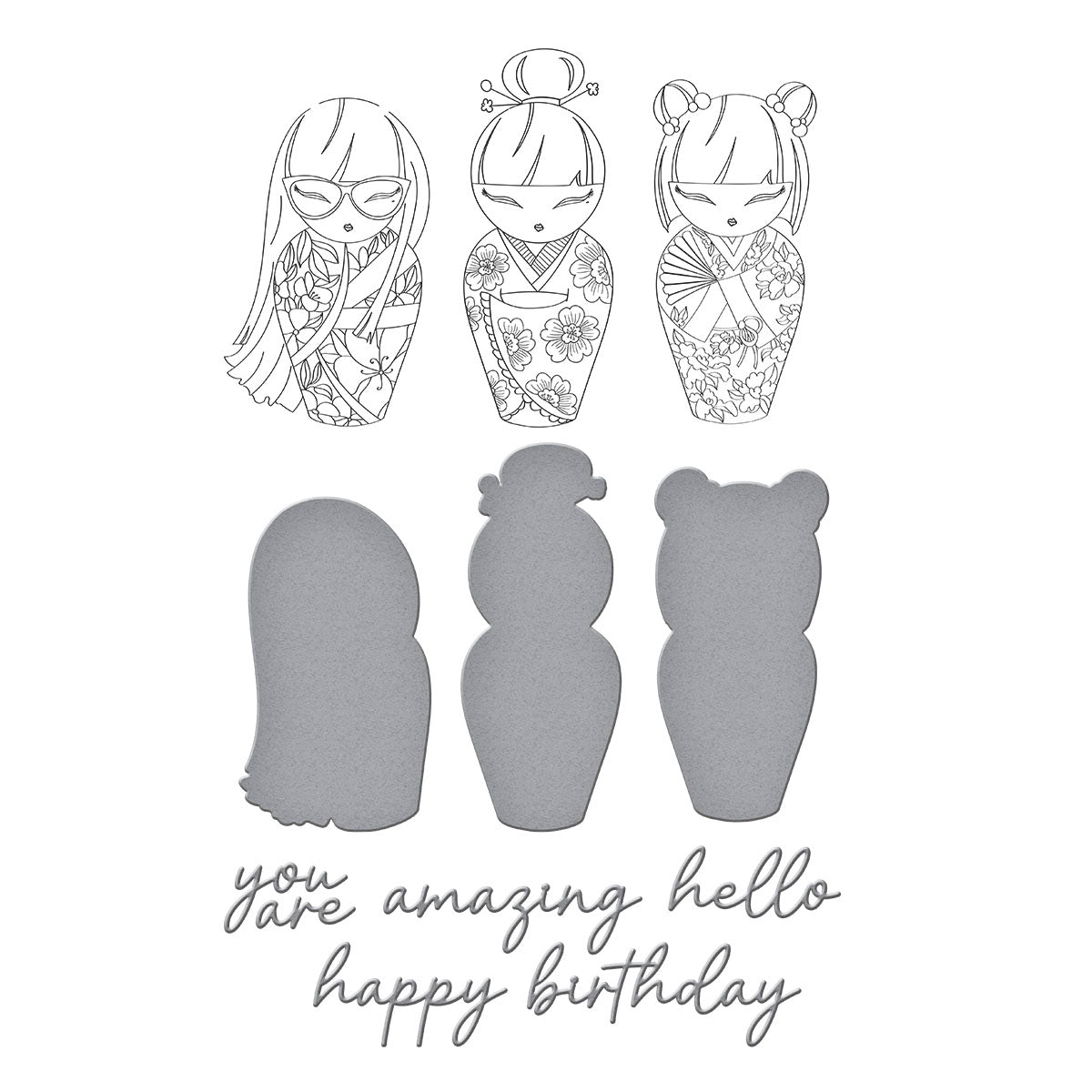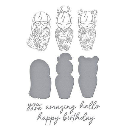 Kokeshi Dolls BetterPress Plate & Die Set is from the Spring in Kyoto Collection by Alex Syberia Designs. The three plates impress three different Kokeshi doll designs in a contemporary style. The eight dies cut the three Kokeshi dolls as well as five words to create sentiments. They include 'birthday', 'hello', 'you', 'are', and 'amazing'. Ink the plates with the BetterPress Ink to be pressed against the BetterPress Cotton Card Panel and Sheets for a crisp letterpress design.