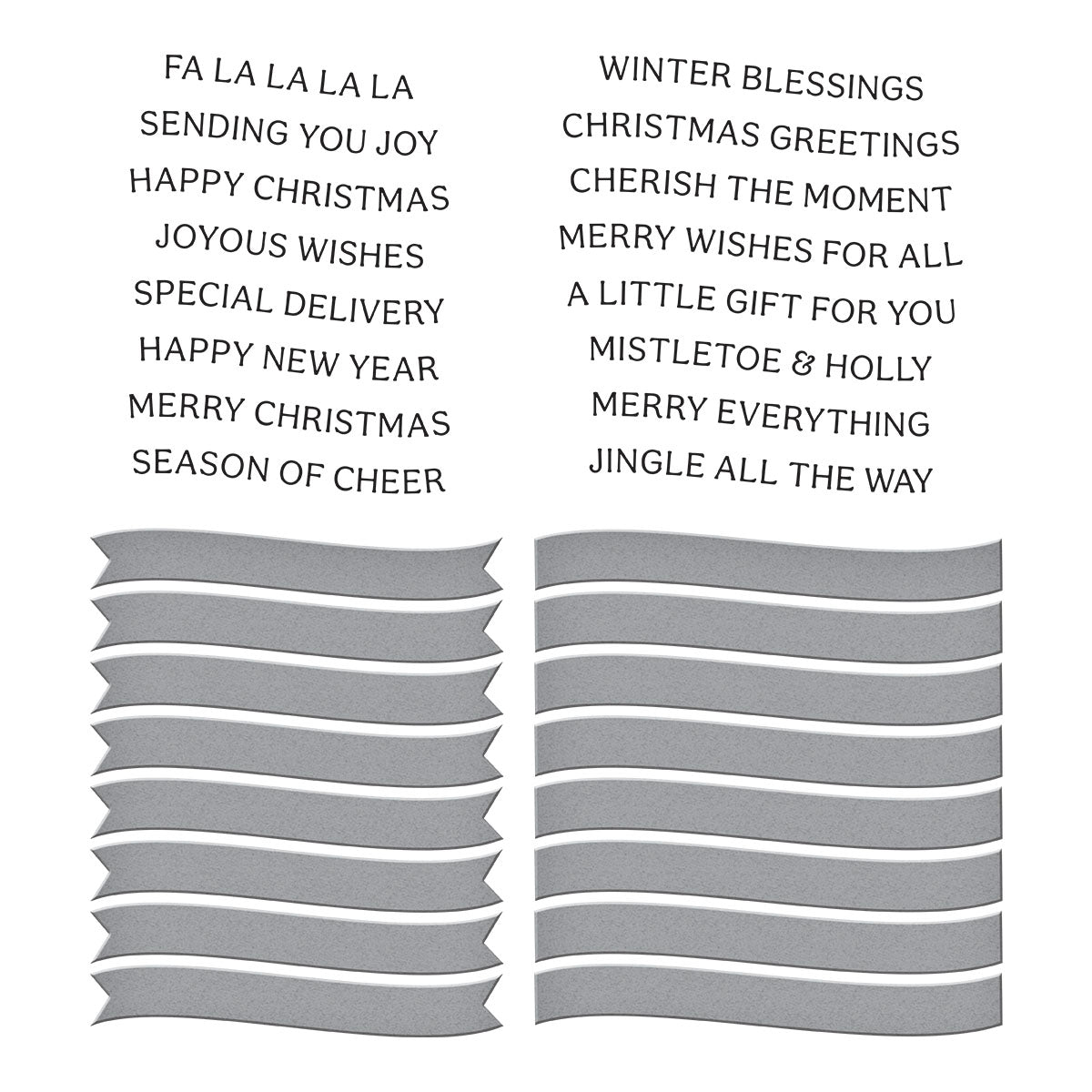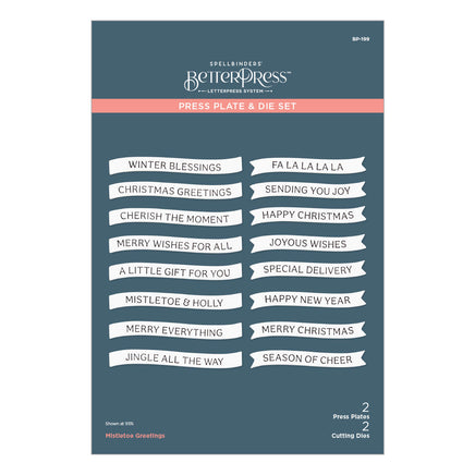 Mistletoe Greetings Press Plate & Die Set is part of the Home for the Holidays Collection. To save time, this set of two press plates each imprint eight fun holiday sentiments for a total of 16 greetings. Die-cut with a choice of two thin metal cutting dies: a slightly curved ribbon-tail banner or a slight curved sentiment strip.