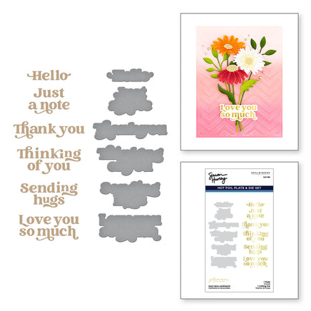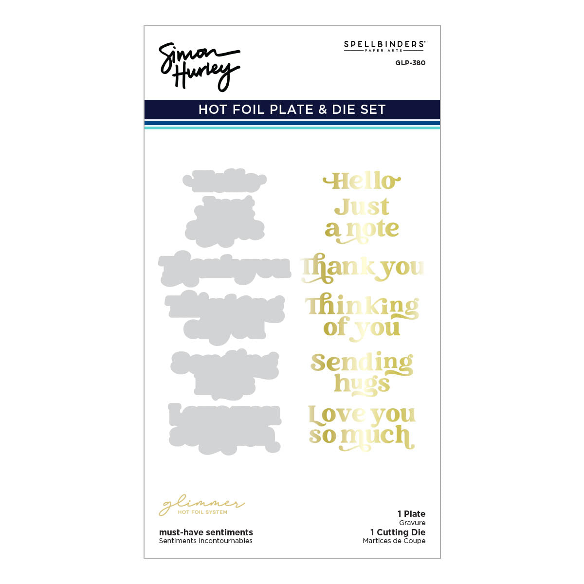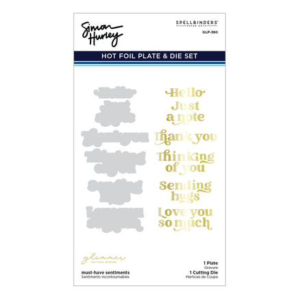 Must-Have Sentiments Glimmer Hot Foil Plate & Die Set is from the Photosynthesis Collection by Simon Hurley. A single plate foils six all occasion sentiments and its coordinating thin metal die cuts them all at once! Make several cards with a couple of movements! As the name says it is a must-have for card makers.