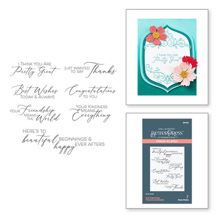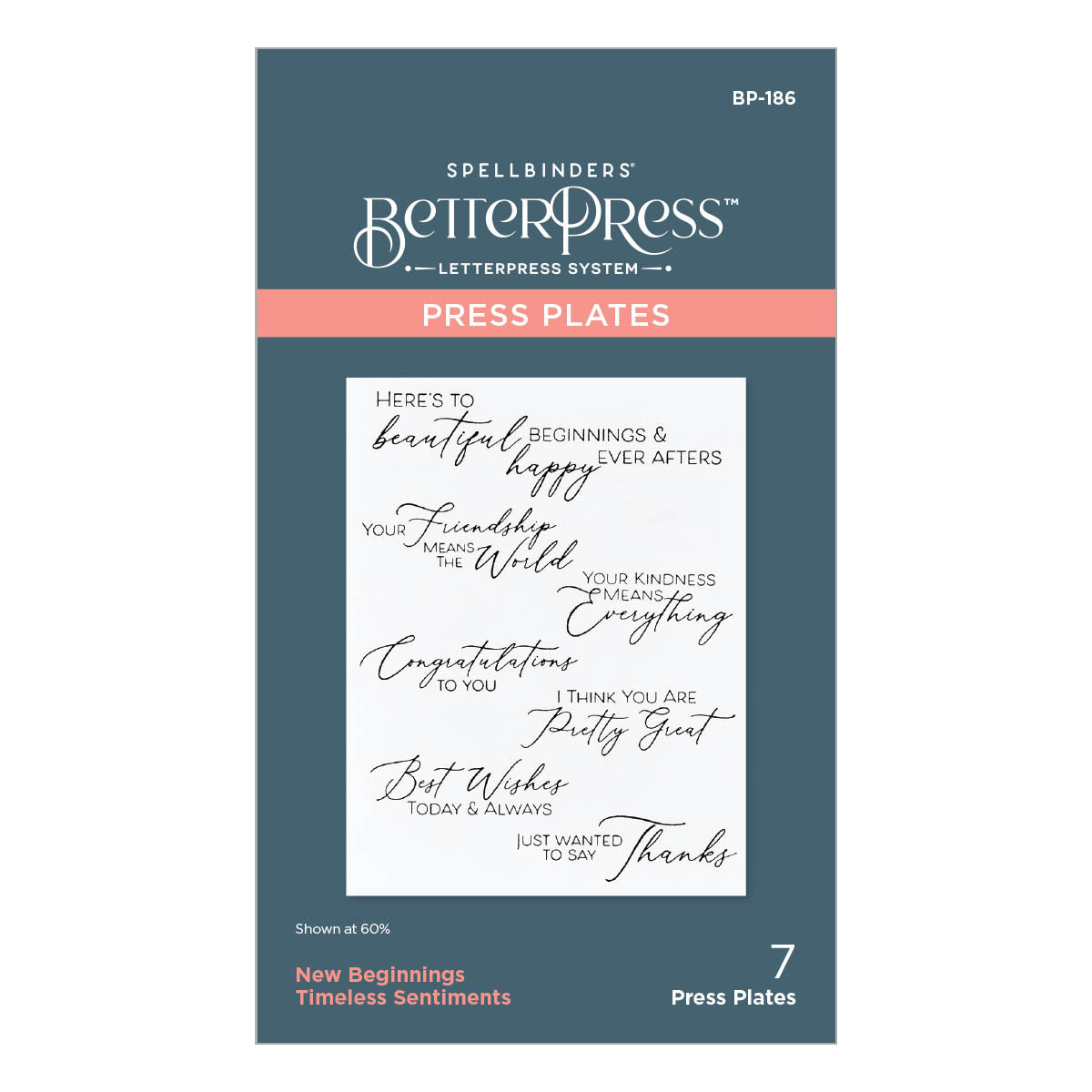 New Beginnings Timeless Sentiments Press Plates are part of the Timeless Collection and include seven press plates. Sentiments are expressions of love, friendship, gratitude and more! A wonderful addition for cardmakers. Ink the plates with the BetterPress Ink to be pressed against the BetterPress Cotton Card Panel and Sheets for a crisp letterpress design.