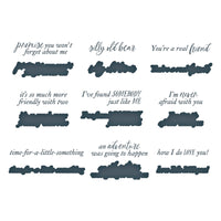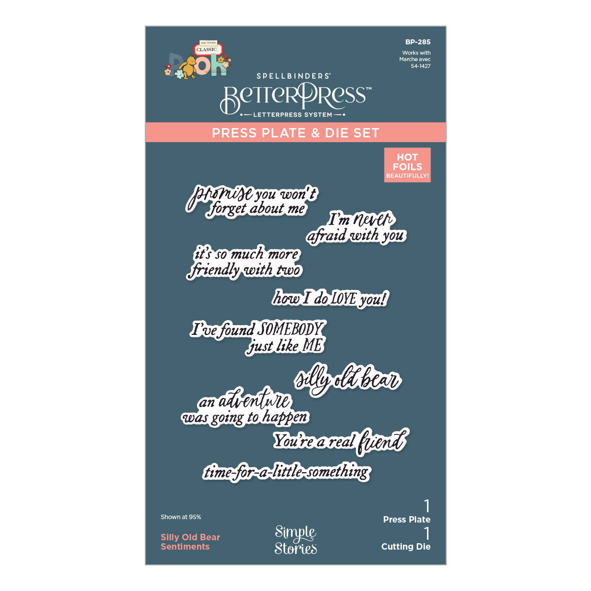 Silly Old Bear Sentiments Press Plate & Die Set is part of the Say Cheese Classic Pooh Collection. The one plate presses eight sweet Pooh phrases all at once and cut with its matching thin metal cutting die for a time-saving step. Used with BP-286 Friendly Moments Press Plates to set the mood in the two scenes. It also works well with the S4-1427 Memory Frames Etched Dies to anchor the ensemble. Ink the plates with the BetterPress Ink to be pressed against the BetterPress Cotton Card Panel and Sheets for a crisp letterpress design.