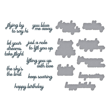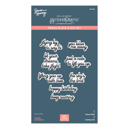 Soaring Sentiments BetterPress Plate & Die Set is part of the Sky's the Limit Collection by Simon Hurley includes one press plate and its coordinating die. This “one and done” sentiment set presses eight sentiments at once and cuts with its accompanying die in one pass. This one sentiment set will have you take flight with your projects! Ink the plates with the BetterPress Ink to be pressed against the BetterPress Cotton Card Panel and Sheets for a crisp letterpress design.