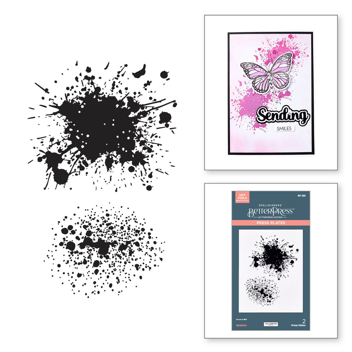 Splatters BetterPress Plate & Die Set is from the Wildflowers Collection by Lisa Horton. The two plates impress two different splatter patterns. A wonderful addition for the mixed media makers as well as those like the messy look without all the mess! Ink the plates with the BetterPress Ink to be pressed against the BetterPress Cotton Card Panel and Sheets for a crisp letterpress design.
