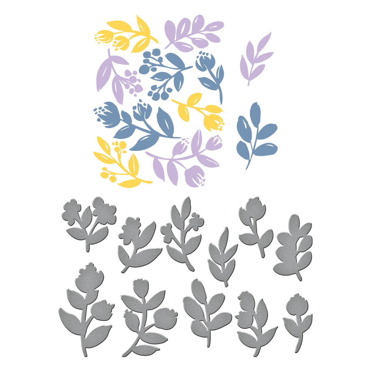 Sprigs Registration Press Plates & Die Set are part of the Cheers to You Collection. This versatile set of 11 press plates and coordinating thin metal dies can be used in a variety of ways to create beautiful, colorful designs. The set also comes with a mylar registration template for perfect placement on a full background botanical print. The full design measures 4.50 in. x 5.75 in./11.5 cm x 14.6 cm.