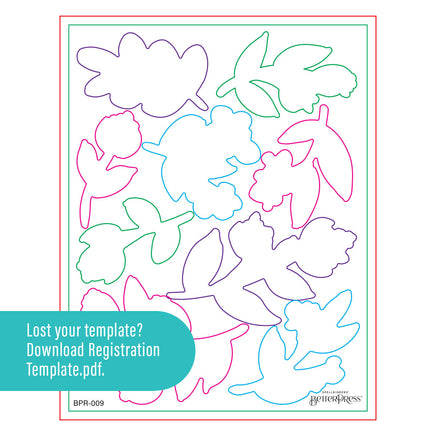 Registration Press Plate sets make creating multi-color letterpress designs simple and foolproof! Simply follow the multi-colored mylar template to layer beautiful colors onto your BetterPress paper for a stunning effect. This clever innovation enhances your letterpress abilities to the next level.