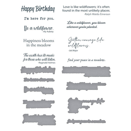 Through the Meadow Sentiments BetterPress Plate & Die Set is part of the Through the Meadow Collection by Susan Tierney-Cockburn. This set of nine plates and nine thin metal cutting dies finishes this collection with beautiful sentiments that can be letterpressed and die-cut with the matching dies. There are nine in total: The earth has its music for those who will listen - Reginald Holmes; Like a wildflower, you bloom wherever you’re planted; Happy Birthday; Be a wildflower -Aly Aubrey; I’m here for you; Happiness blooms in the meadow; Love is like wildflowers, it’s often found in the most unlikely places - Ralph Waldo Emerson; find your peace in a meadow; Gather courage like wildflowers - Jak Major. Ink the plates with the BetterPress Ink to be pressed against the BetterPress Cotton Card Panel and Sheets for a crisp letterpress design.