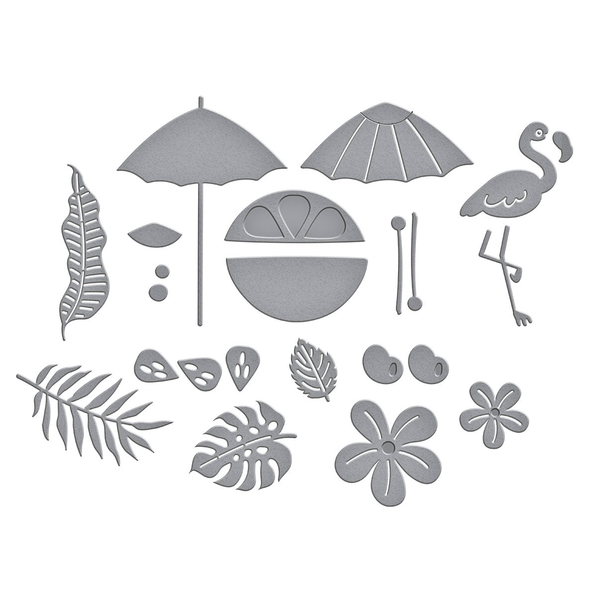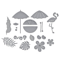 Tropical Flair Etched Dies are part of the Happy Hour Collection. This set of 15 thin metal cutting dies have so many fun designs for everything tropical! It includes florals, leaves, flamingo, citrus and even an umbrella to add to drinks! Mix and match with the other sets in the collection for a festive vibe!